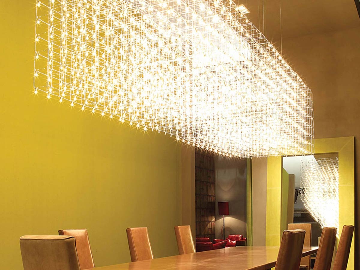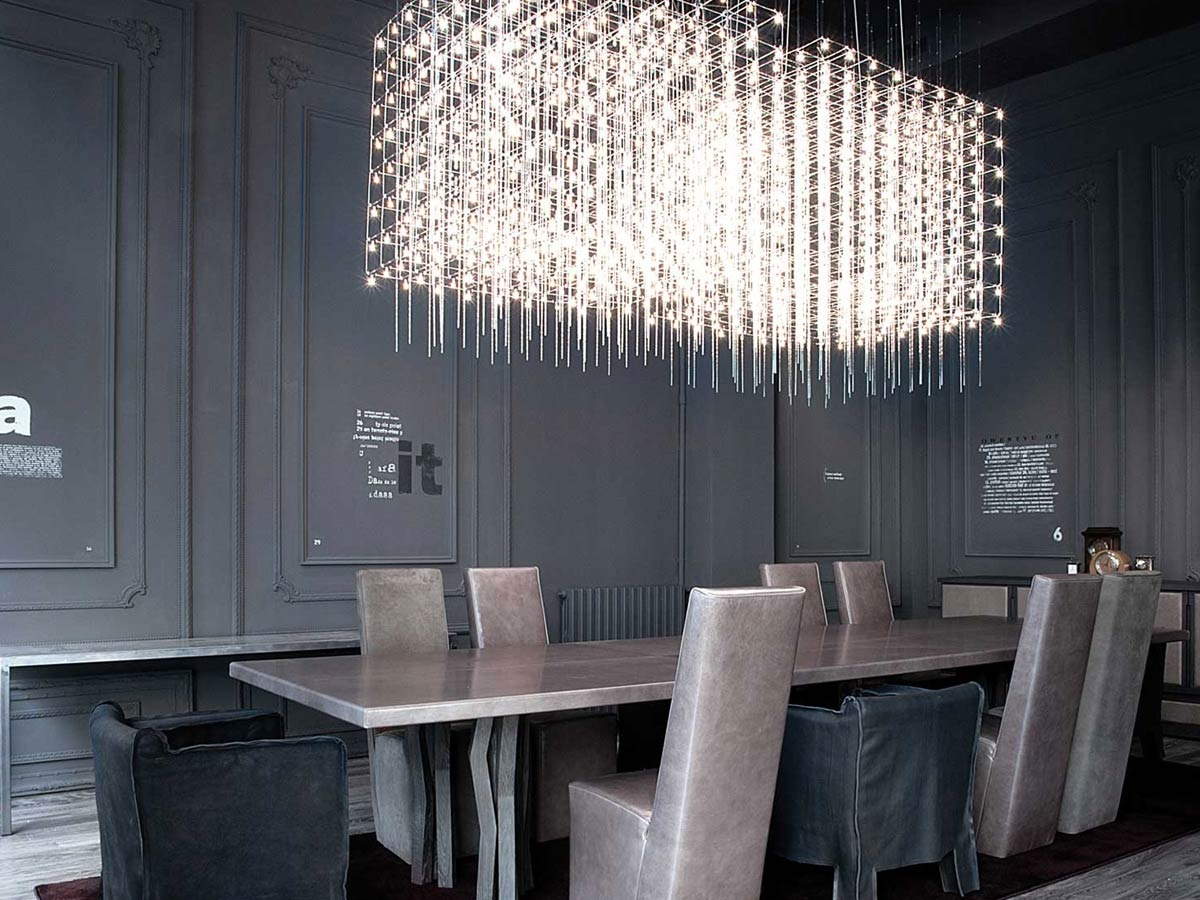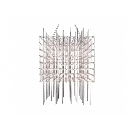 Q3 es una lámpara colgante de Baxter que recuerda visualmente a una jaula de metal clásica. Esta lámpara tiene crudos de níquel curvos, conectados con abrazaderas especiales con soporte de bombilla incorporado. Su frige, compuesto por 64 palos de vidrio extraíbles, añaden elegancia y lujo. Q3 está hecho con 552 bombillas light 2W-12V: un mueble con una individualidad importante como singularidad exclusiva. Solicita un presupuesto personalizado de Mobilificio Marchese y recibe nuestro mejor precio.