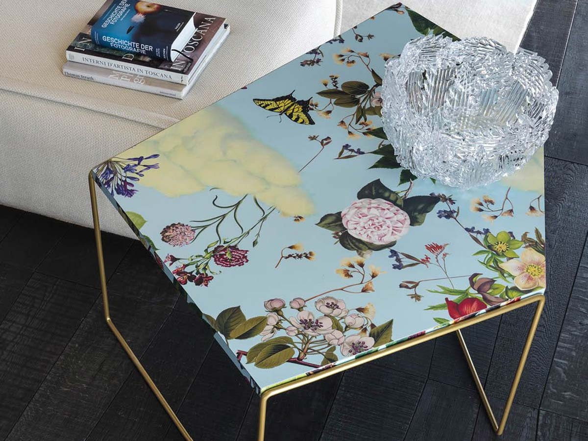 Una colección de mesas de centro en varios tamaños creadas como un conjunto de tres que pueden pararse solas en el centro de la sala de estar o usarse como mesas auxiliares, según se desee. Zagazig de Driade tiene formas irregulares y dinámicas, está disponible en tres alturas y tamaños diferentes. Presenta un collage asimétrico de stripes de colores anchos y decoraciones florales. Viene en tres patrones diferentes hechos de bilaminado impreso digital con diseños contemporáneos, muy distintivos. Elegante y etérea, la base cableada está hecha de acero dorado. Póngase en contacto con nosotros para un presupuesto personalizado.