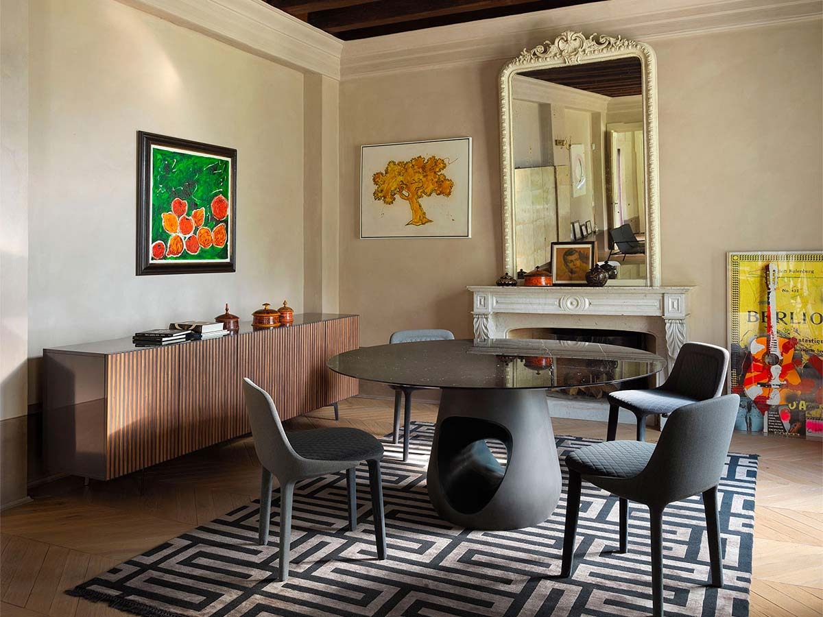 La mesa se inspira libremente en las obras de la escultora inglesa Jocelyn Barbara Hepworth, y en su incesante estudio de la relación entre los seres humanos, el entorno natural y los materiales. La forma escultórica, las generosas dimensiones y los preciosos mármoles contribuyen a dar a la mesa un aspecto lujoso y contemporáneo con indudable personalidad.