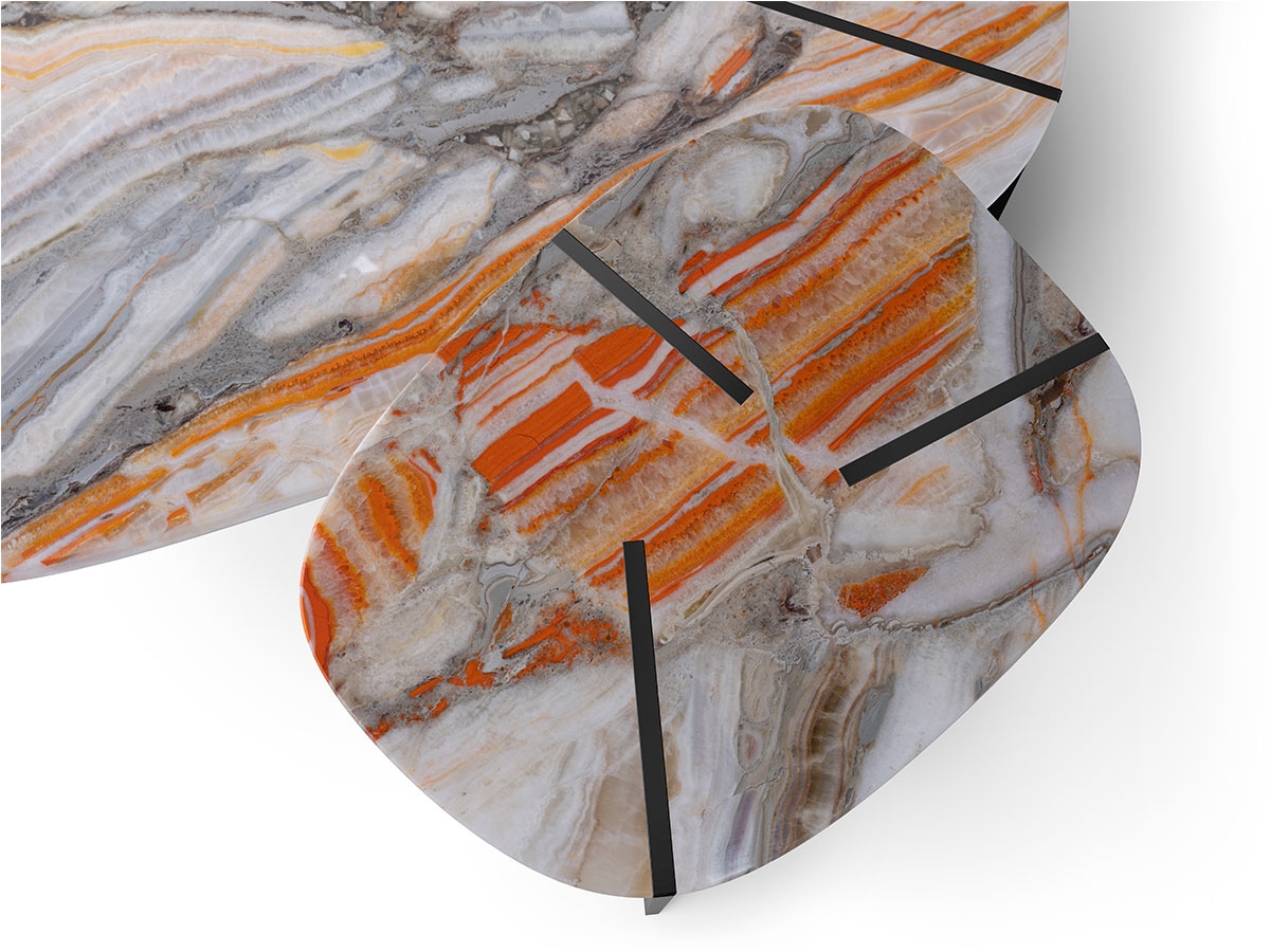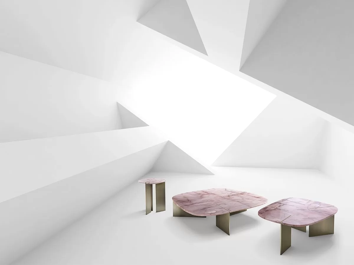 Exuberante, precioso, ecléctico. Esto es Rumors: la nueva mesa de centro Arketipo . El material es el claro protagonista de este artículo de decoración del hogar, que ve el mármol empleado para las tapas. Con cada pieza, tres cuchillas metálicas debajo de la faja la parte superior y la cruzan con cortes limpios y precisos que interrumpen el abigarrado veteado de mármol de la superficie curvilínea, produciendo contrastes cautivadores entre líneas y áreas, explícitas e implícitas, que son orgánicas y naturales y aquellas que son racionales y geométricas. La base geométrica completa este diseño innovador, creando una obra maestra del diseño.