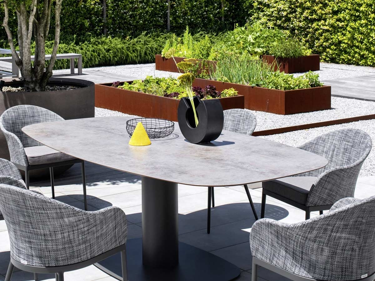 La mesa Big es un mueble fijo apto para zonas marinas, creado por R&D Varaschin, diseñador de la marca. Su idea recuerda "un antiguo oficio proyectado en un diseño moderno", lo que puede verse en esta obra maestra: la estructura metálica recuerda una sensación de antigüedad que evoluciona hacia algo moderno gracias a su forma elíptica.
