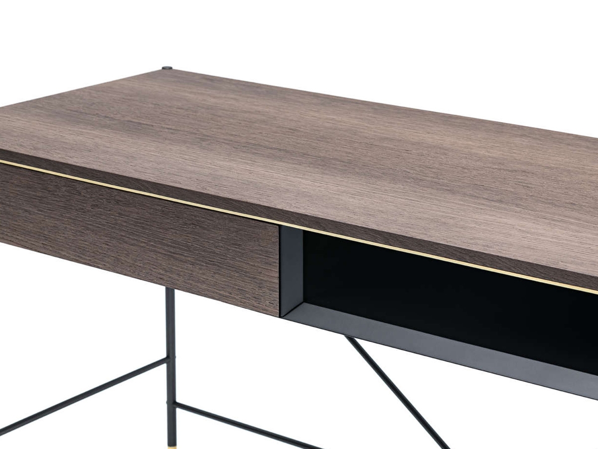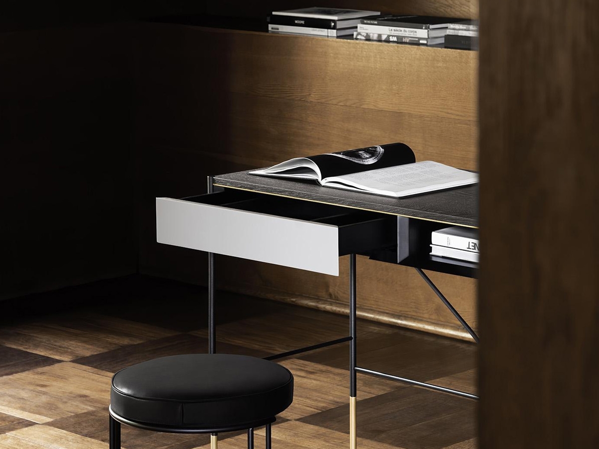 Su sencillez, elegancia y ligereza hacen de Era un elemento de diseño único e irresistible. Tanto como toda la familia Era, el escritorio presenta unas líneas gráficas y marco de chapa de acero pintado en latón, una característica que define todo el perímetro del escritorio.