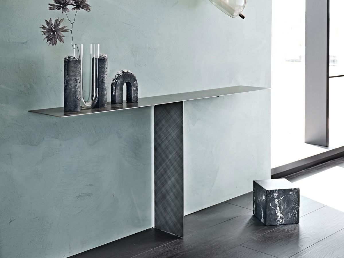 La consola Tee de Cattelan Italia, diseñada por Paolo Cattelan, presenta un diseño minimalista y llamativo. Tee es una consola que define la forma a partir del material, concretamente una plancha de acero, lo que la convierte en un mueble único. De hecho, la limpieza conceptual y estructural que define a Tee sabrá aportar un toque de elegancia y clase a tu salón y entrada.