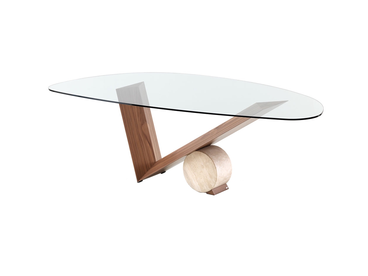 Mesa en nogal Canaletto o roble quemado y cilindro en travertino, marquina negra o mármol blanco de Carrara. Tapa en vidrio transparente, colocada sobre la base.