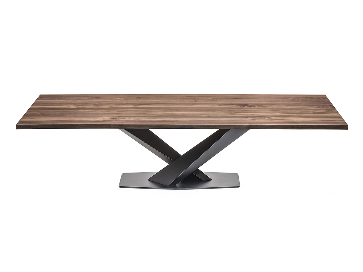 Stratos Wood by Cattelan es una mesa moderna con un diseño elegante y refinado. Tiene una base de acero hecha de dos formas X angulares y brillantes y una tapa de madera. Disponible en diferentes acabados y tamaños.