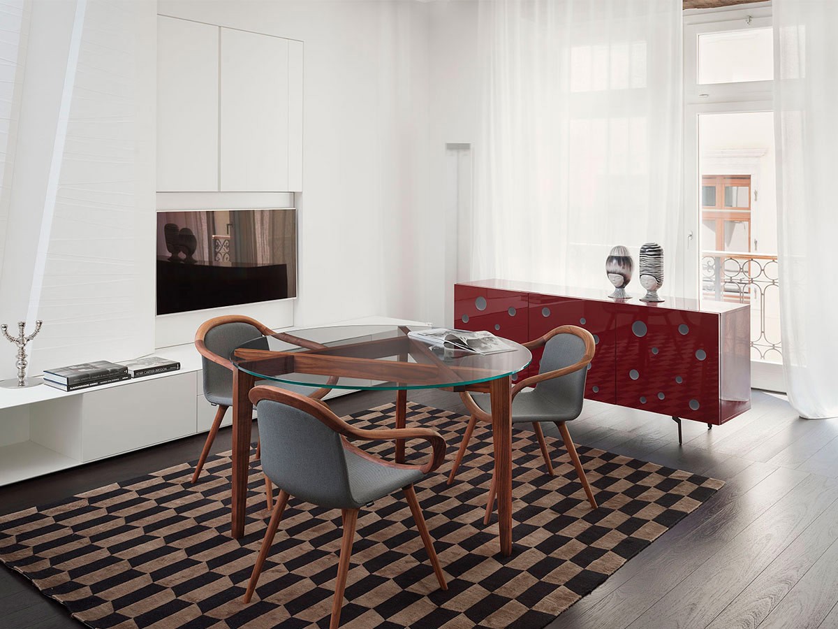 Si buscas un mueble para tu comedor, la silla Ginevra es la solución. Nacido de la creatividad del Studio Balutto para Horm, Ginevra es un sillón de madera maciza que esconde una gran cantidad de complejos trabajos tecnológicos, fruto de la experiencia y los conocimientos de los diseñadores. Lo que hace de Ginevra un mueble tan importante para tu comedor es su elegancia innata combinada con el confort anatómico del asiento. De hecho, Ginevra tiene una estructura de nogal tapizada en cuero o tela con reposabrazos para un máximo confort.