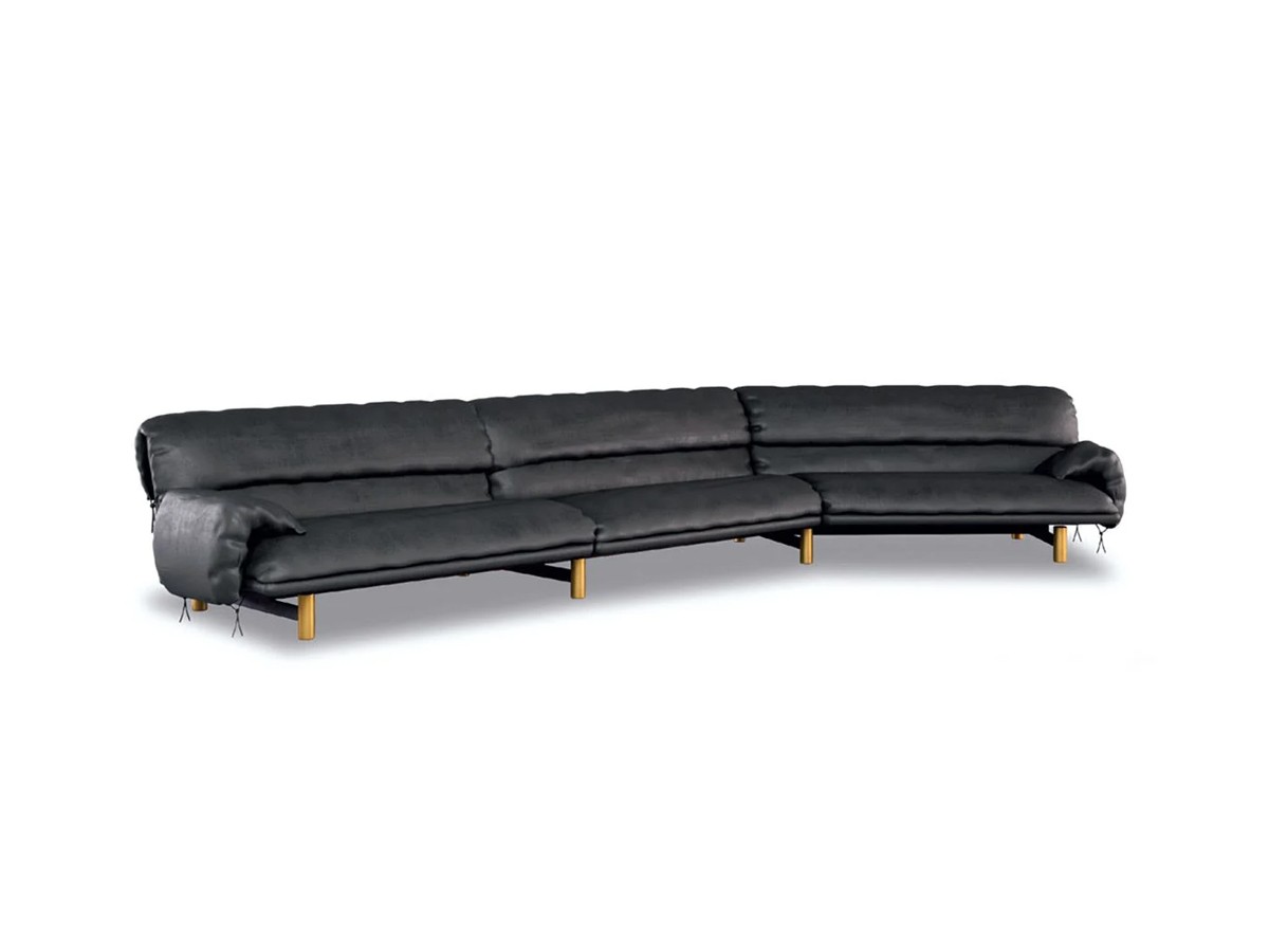 Jo se compone de una estructura metálica pintada en negro mate, tapizada en espuma de poliuretano de densidad diferenciada con relleno de pluma de ganso lavada y esterilizada. Todo el sofá se apoya en el suelo gracias a unos pequeños pies a elegir entre latón satinado, metal bruñido cepillado a mano o metal niquelado satinado.
