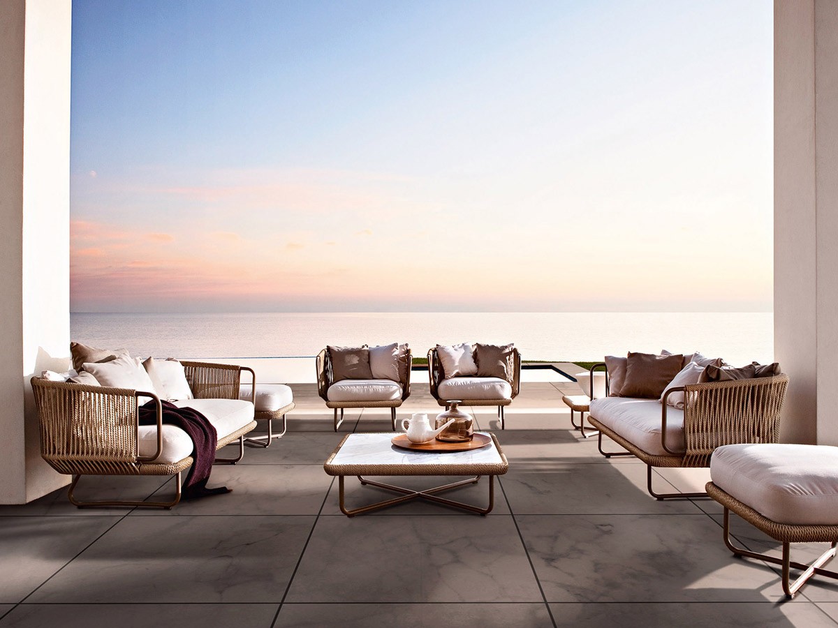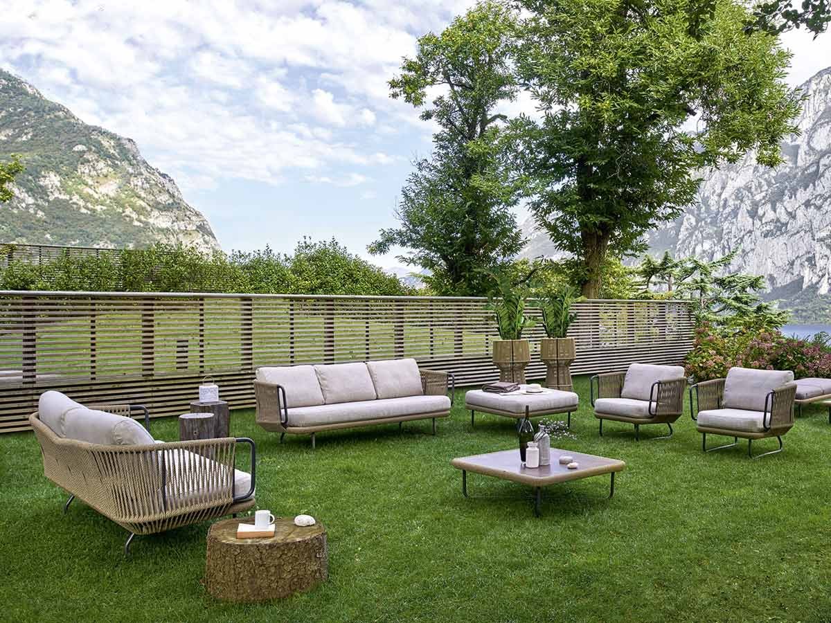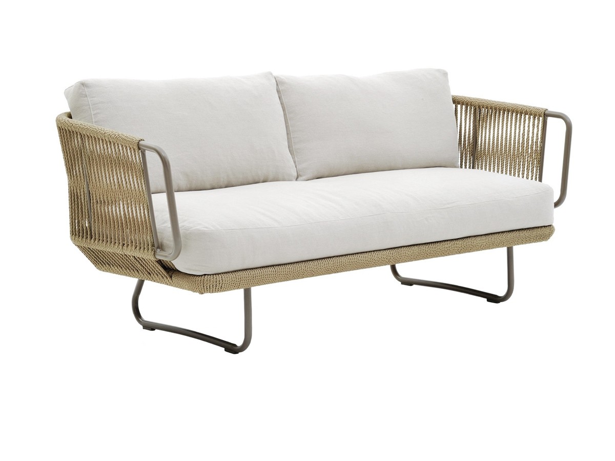 El sofá Babylon de Varaschin, fabricado por Giopato & Coombes, es un mueble perfecto para espacios exteriores residenciales y de contract. Babylon forma parte de una colección de asientos que reúne sofás de dos y tres plazas, sillón, puf y mesas bajas de aluminio pintado y cuerda de fibra sintética. El sofá Babylon, así como todos los elementos, se caracterizan por una elegante trama, interpretada en clave de combinar una estética del presente con una impronta de tradición.