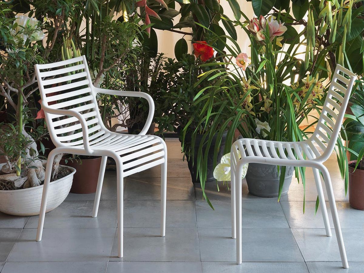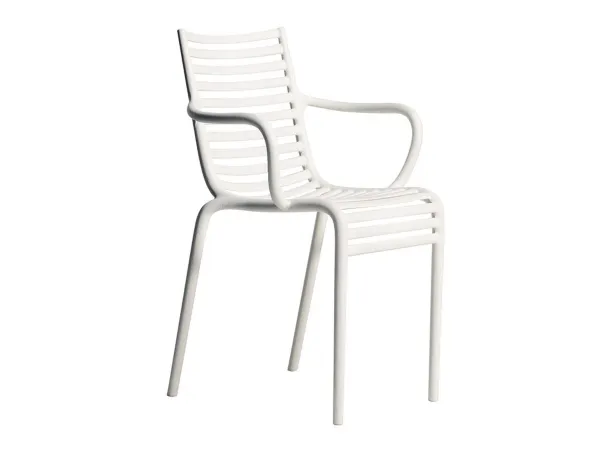 El aireado, ligero y apilable pip-e Armhair de Driade fue creado por uno de los representantes más famosos del nuevo diseño en 2007: Philippe Starck. Debido al material plástico, la silla es adecuada para uso en interiores y exteriores. Disponible en colores blanco y negro. Materiales: polipropileno.