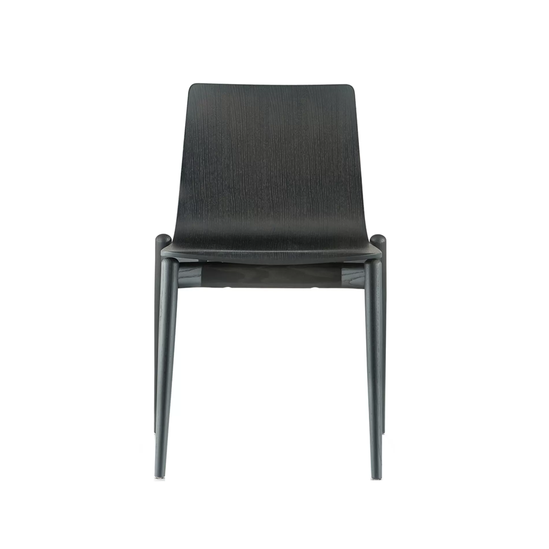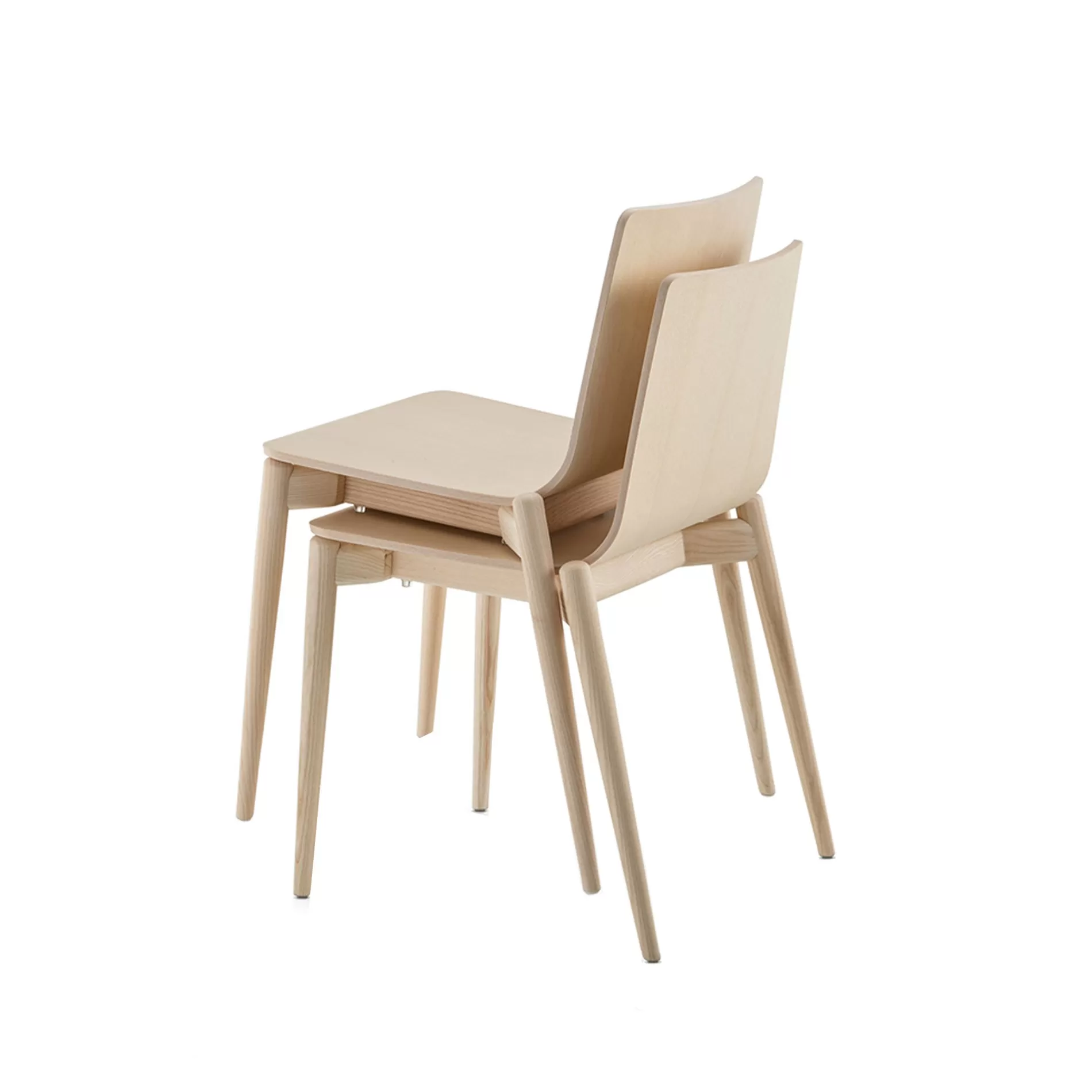La silla Malmö, diseñada por Cazzaniga, Mandelli y Pagliarulo para Pedrali, tiene un marco de madera de fresno y una carcasa de madera contrachapada. Apilable y disponible en diferentes colores.