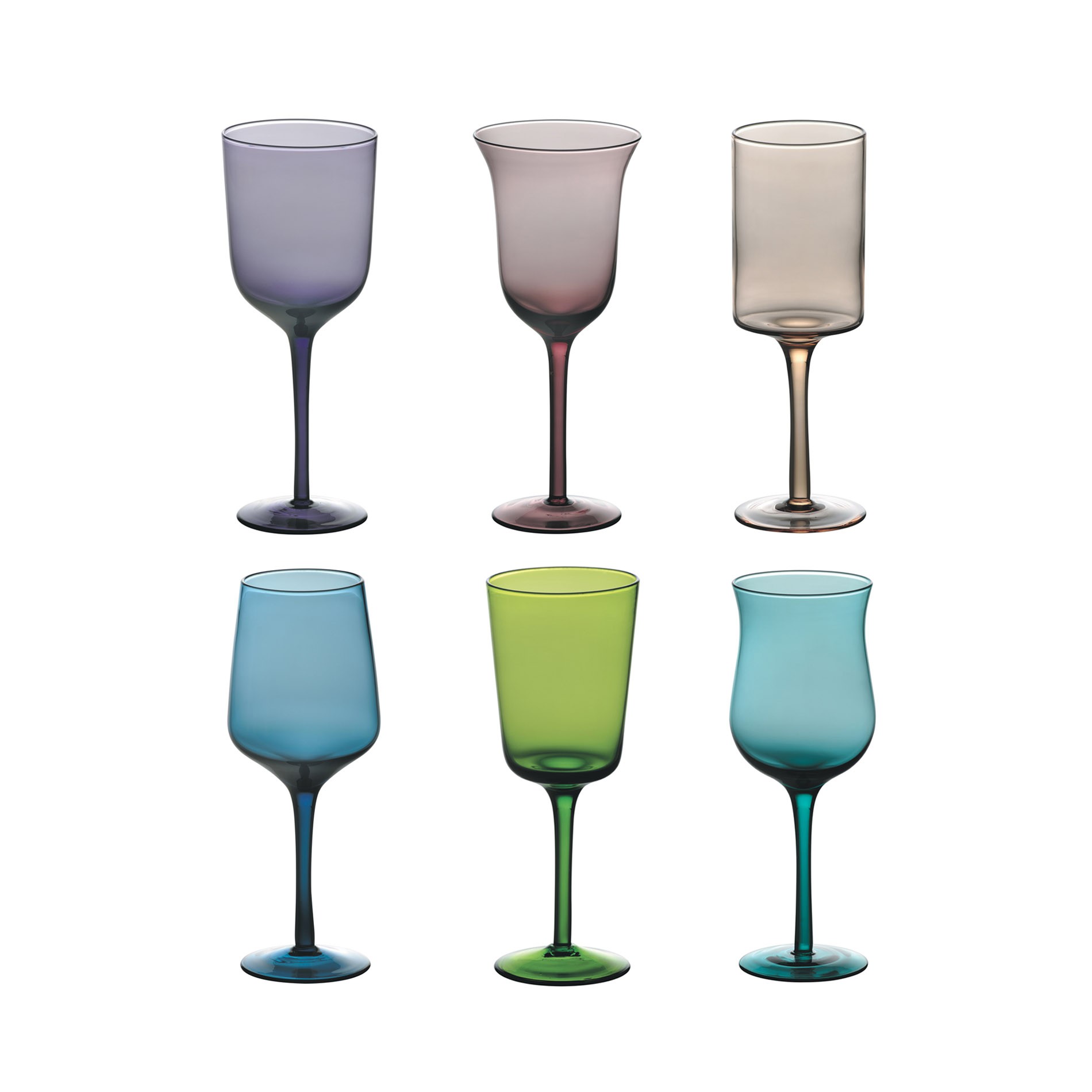Diseguale de Bitossi es un conjunto de seis copas hechas de formas y colores mixtos. Una silueta casual y colores variados hacen que cada vidrio cobre vida... ¡Para nunca perder de vista tu bebida! Lavaplatos.