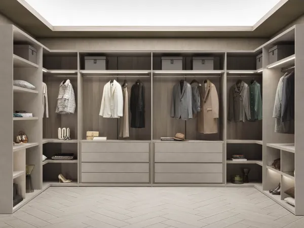 Le dressing Sipario de Pianca est caractérisé par l'élégance, l'ordre et le raffinement. Il se compose de modules d'armoires sans portes qui peuvent être combinés librement en fonction de vos besoins et de vos goûts. En collaboration avec notre équipe d'architectes, vous pouvez concevoir votre dressing Sipario en le personnalisant avec les éléments d'intérieur et les accessoires dont vous avez besoin.
