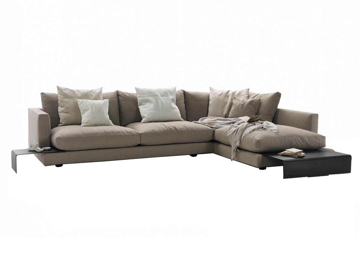 Relax and style in the living room with the modular sofa Long Island 05 by Flexform. Distinctive note is the design of the armrest slightly set back from the base, on which handy service tables can be inserted, covered in cowhide, which fit perfectly into the sofa. Supported by covered feet. Product fit-in backrest. Available in different sizes and colours. Removable fabric covering or non-removable leather.