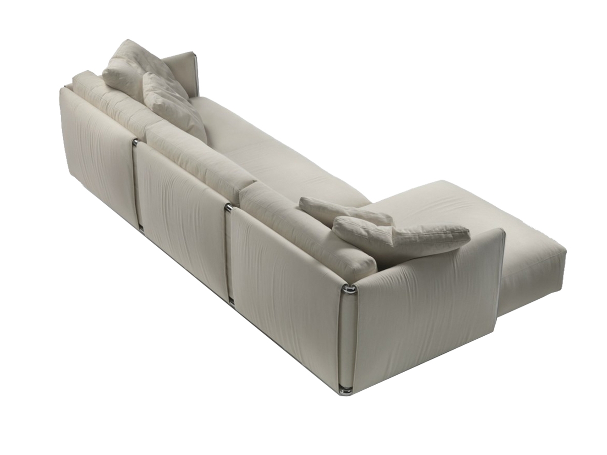 Edmond sofa, design by Carlo Colombo for Flexform, is just as innovative as it is versatile. Its base consists of a metal frame oven enamelled with epoxy powder, while the structure is in metal with polyurethane filling covered in coated protective fabric. The back cushions are feather with a crushproof material insert.