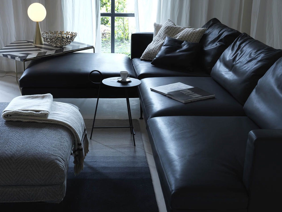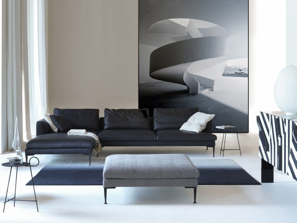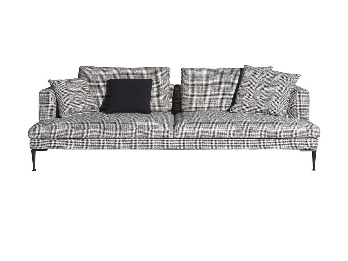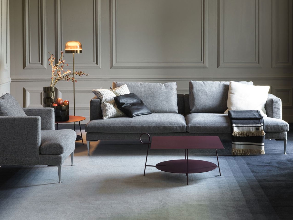 Steel structure with elastic belting and padding in polyurethane foams with different densities. Seat cushions in polyurethane foams with different densities and reversible back cushions in feather and synthetic fiber with different comfort. Removable cover in fabric or fixed in leather. Feet in cast aluminum, painted in black or silver color. Indoor use only. The sofa Lirico is also available in the modular version. Contact us today for a custom quotation.