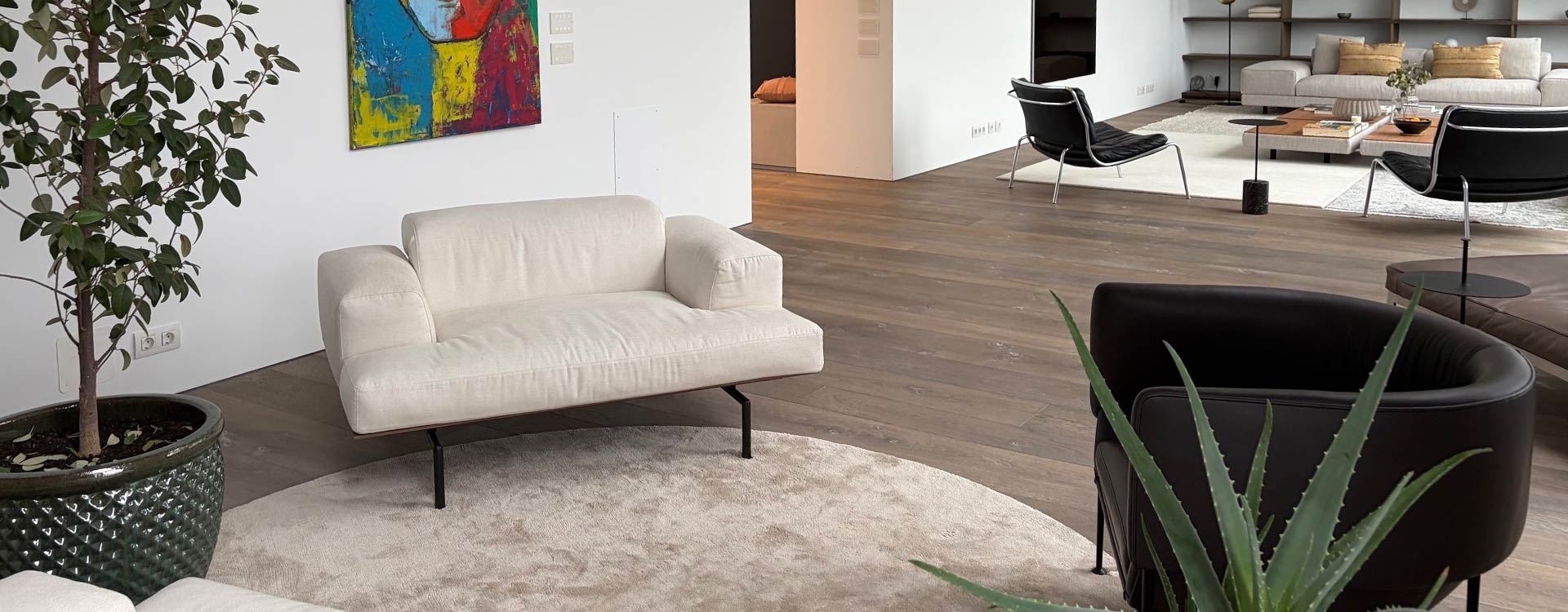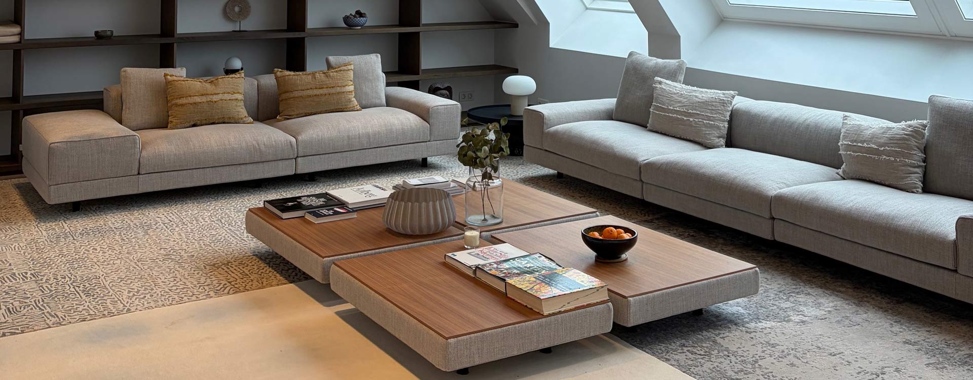 Les tables Lorentz assorties, avec leurs plateaux bas en bois, font office de plate-forme continue entre les canapés, accueillant livres et objets sans interrompre la lecture architecturale du grand salon. Une palette neutre – tissus clairs, bois chaleureux, murs blancs – permet aux proportions et à la lumière de définir le caractère de l'intérieur.