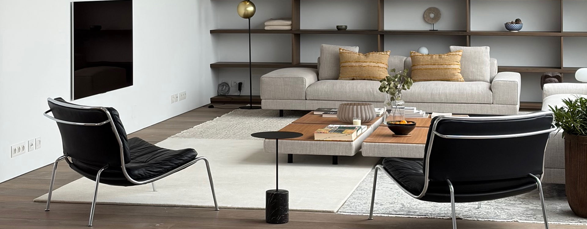 La colonne vertébrale du projet est le système d'assise Lorentz de Living Divani, conçu par David Lopez Quincoces, utilisé dans une configuration double pour créer deux espaces de conversation : un plus intime à l'entrée et un plus grand à l'autre bout de l'appartement-terrasse. La base encastrée et l'aspect suspendu des coussins soulignent la longueur de la pièce, tandis que la bibliothèque sur mesure pleine hauteur sert de toile de fond scénique.