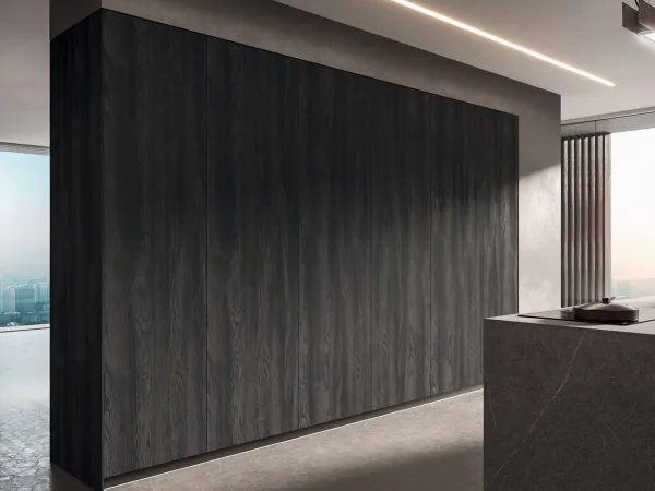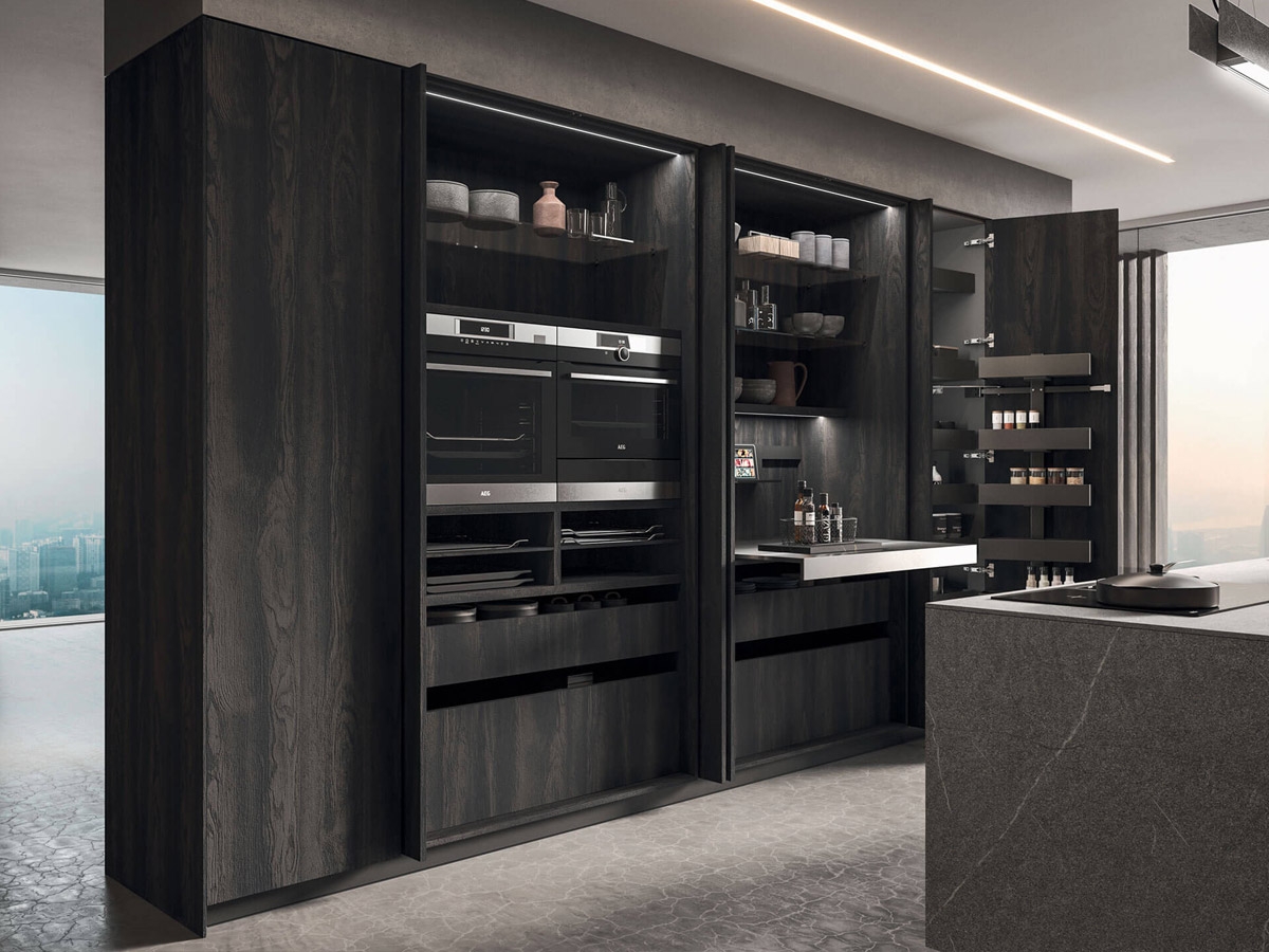 Les colonnes à portes escamotables permettent une totale liberté de mouvement. Différentes solutions internes satisfont tous les besoins quotidiens de la cuisine. Le système de fermeture de porte simple et rapide permet à la composition de récupérer ses contours linéaires uniques et essentiels, offrant une élégance totale.
