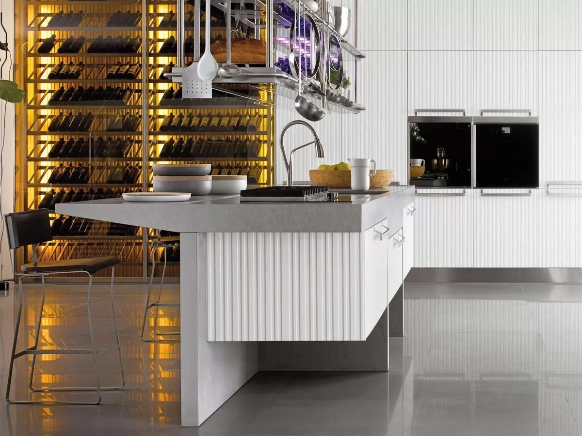 La pierre et le bois sont les éléments exclusifs de Lignum et Lapis, utilisés dans le dessin et dans la créativité du projet. Des recherches formelles et technologiques ont permis de réaliser des îlots, des plans, des comptoirs en pierre, véritables sculptures industrielles et matiéristes. Avec son dessin exclusif à lattes de largeur et de distance variables, la porte inédite exalte la valeur du bois naturel. Elle est disponible dans les finitions mélèze, acajou, chêne nordique et dans toutes les couleurs laquées de la Collection.
