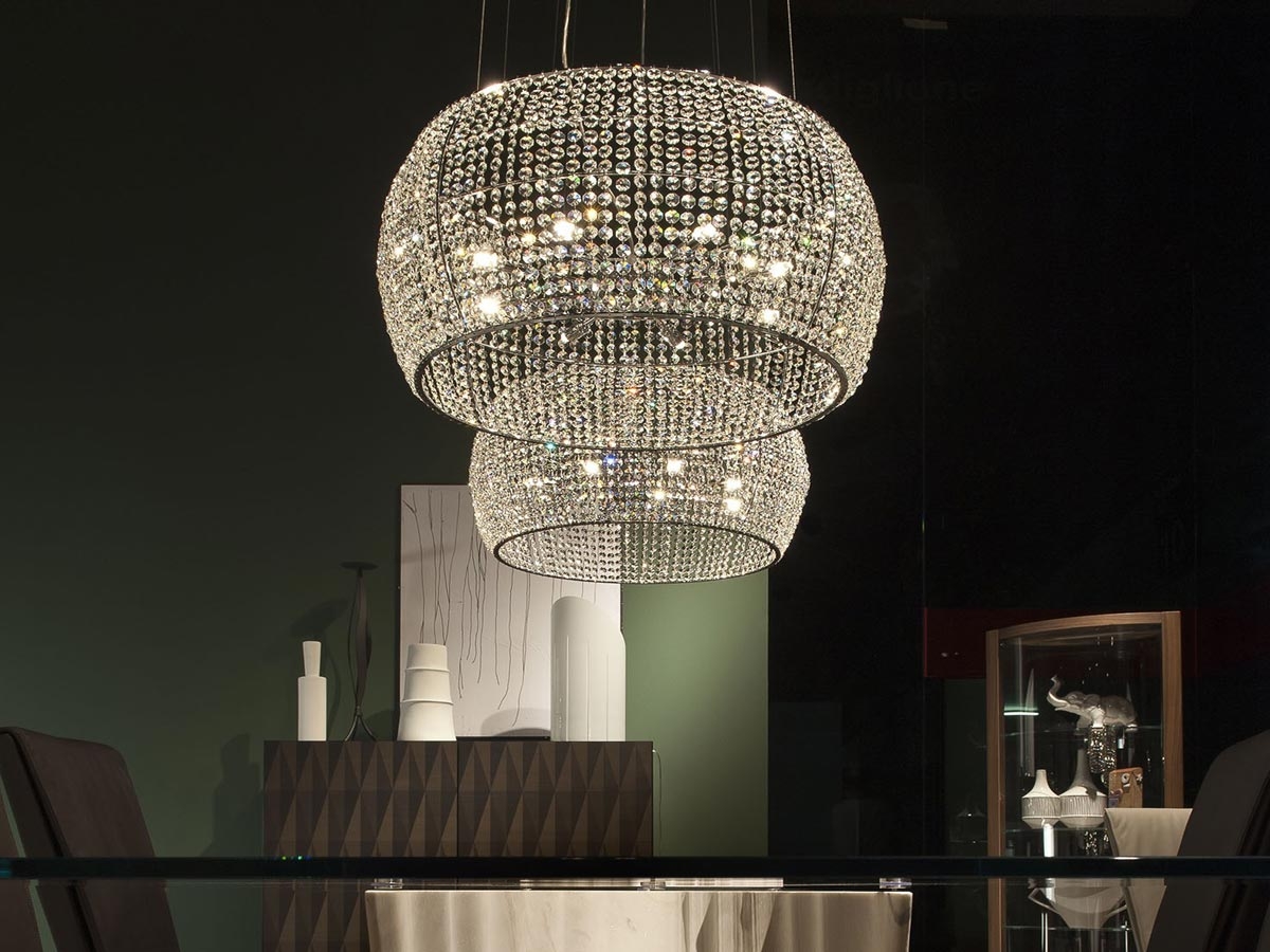 Suspension lamp with chromed steel frame and lampshade made of glass pendants. The model cm Ø48 fits 4 light bulbs with G9 screw base, maximum 25W. The models cm Ø60 and 80 fit 8 light bulbs with G9 screw base, maximum 25W.