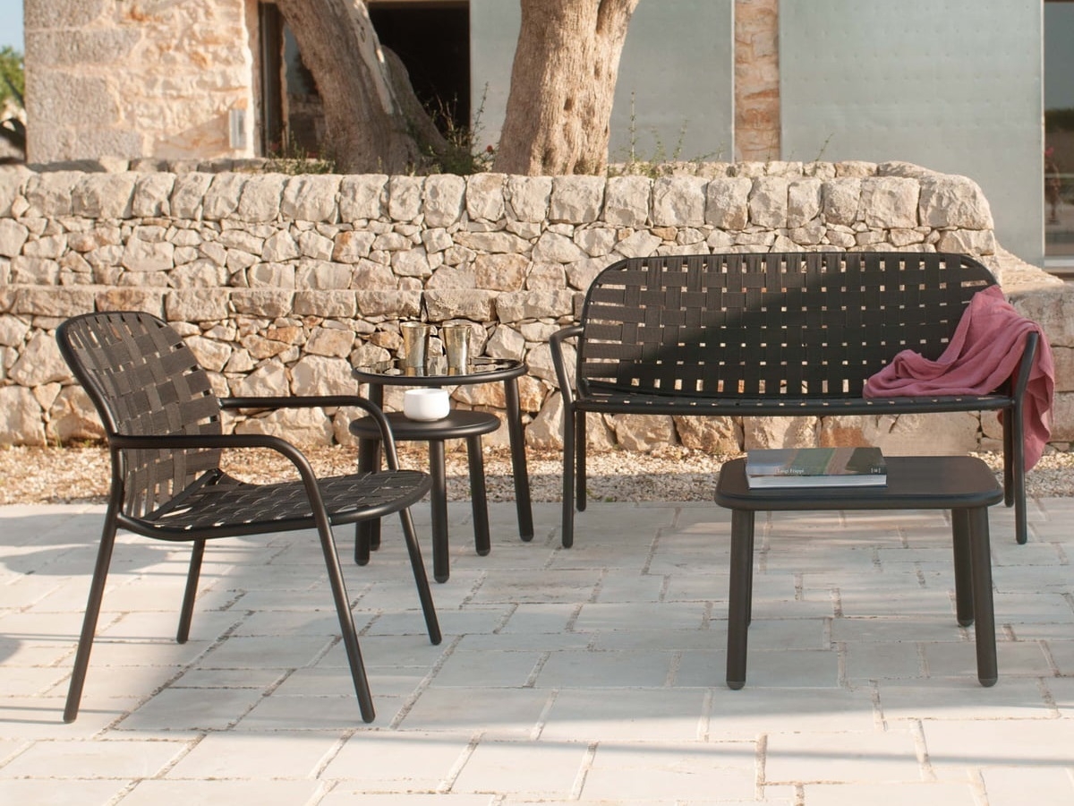 Yard by Emu est un canapé d'extérieur sophistiqué. Les sangles élastiques tissées créent un siège et un dossier uniques et ajoutent un détail éclectique dans sa conception. Un élément de mobilier qui attire l'attention, avec un équilibre parfait entre style et confort.