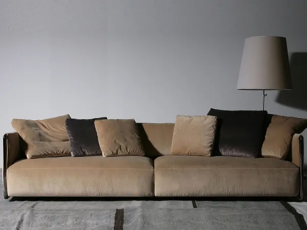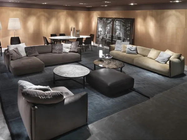 Edmond sofa, design by Carlo Colombo for Flexform, is just as innovative as it is versatile. Its base consists of a metal frame oven enamelled with epoxy powder, while the structure is in metal with polyurethane filling covered in coated protective fabric. The back cushions are feather with a crushproof material insert.