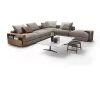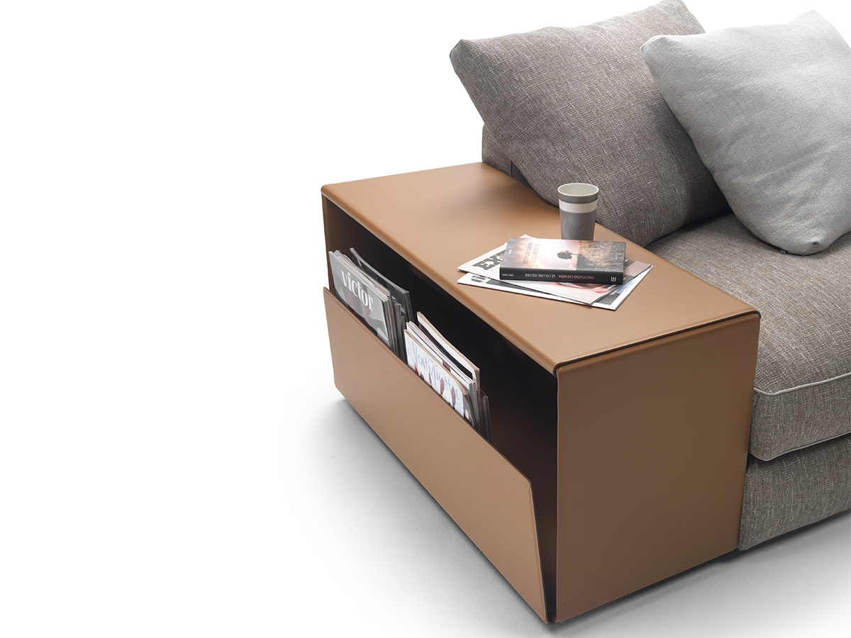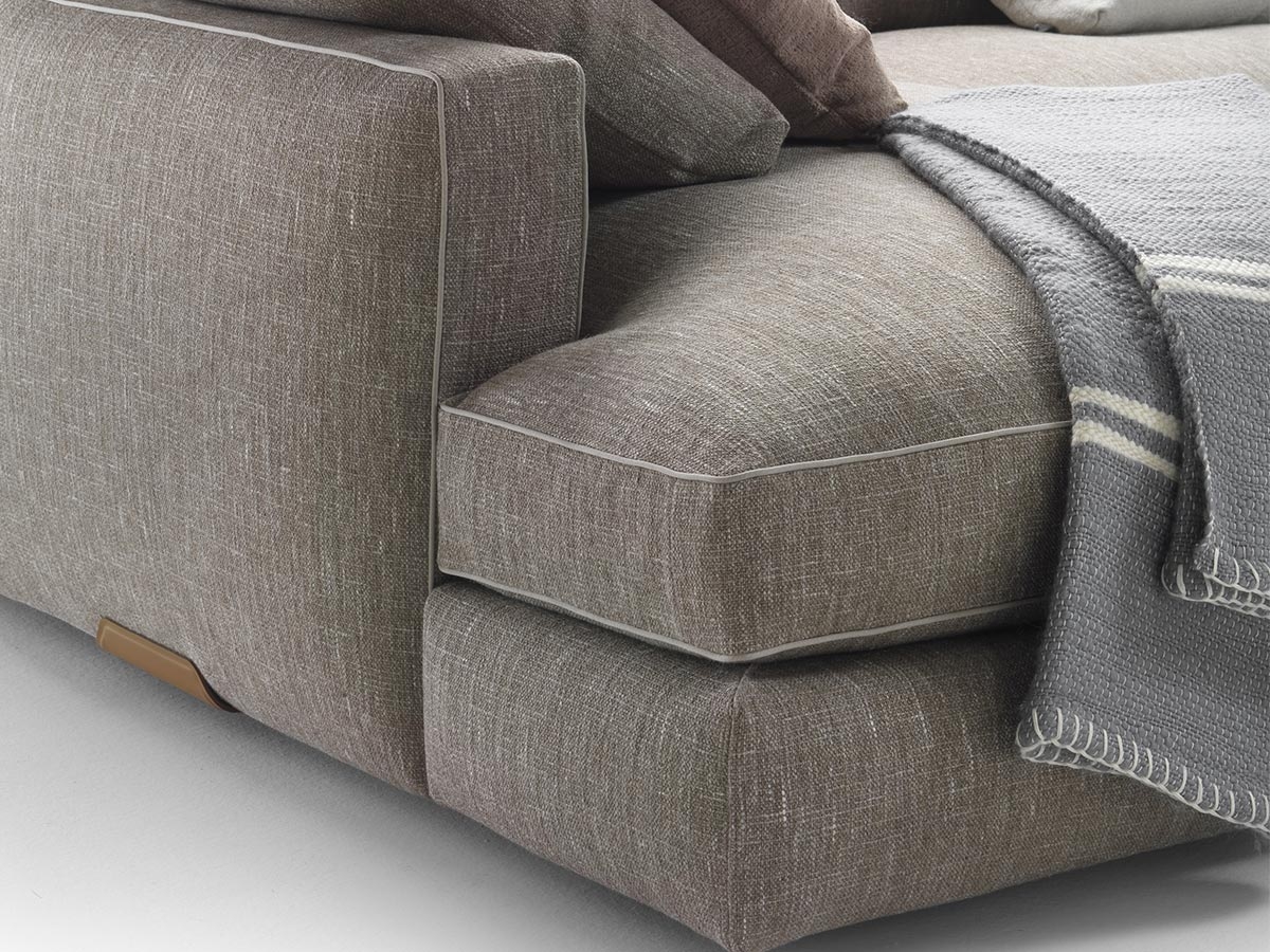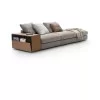 L'élément distinctif sont les accoudoirs de rangement recouverts de cuir, conçus pour différents usages : le compartiment peut être utilisé pour ranger des plaids, des magazines, des livres et une étagère pratique pour ranger télécommande, smartphone et petits objets. Sur le côté et au dos, les détails en cuir ou en métal soulignent son élégance mesurée.
