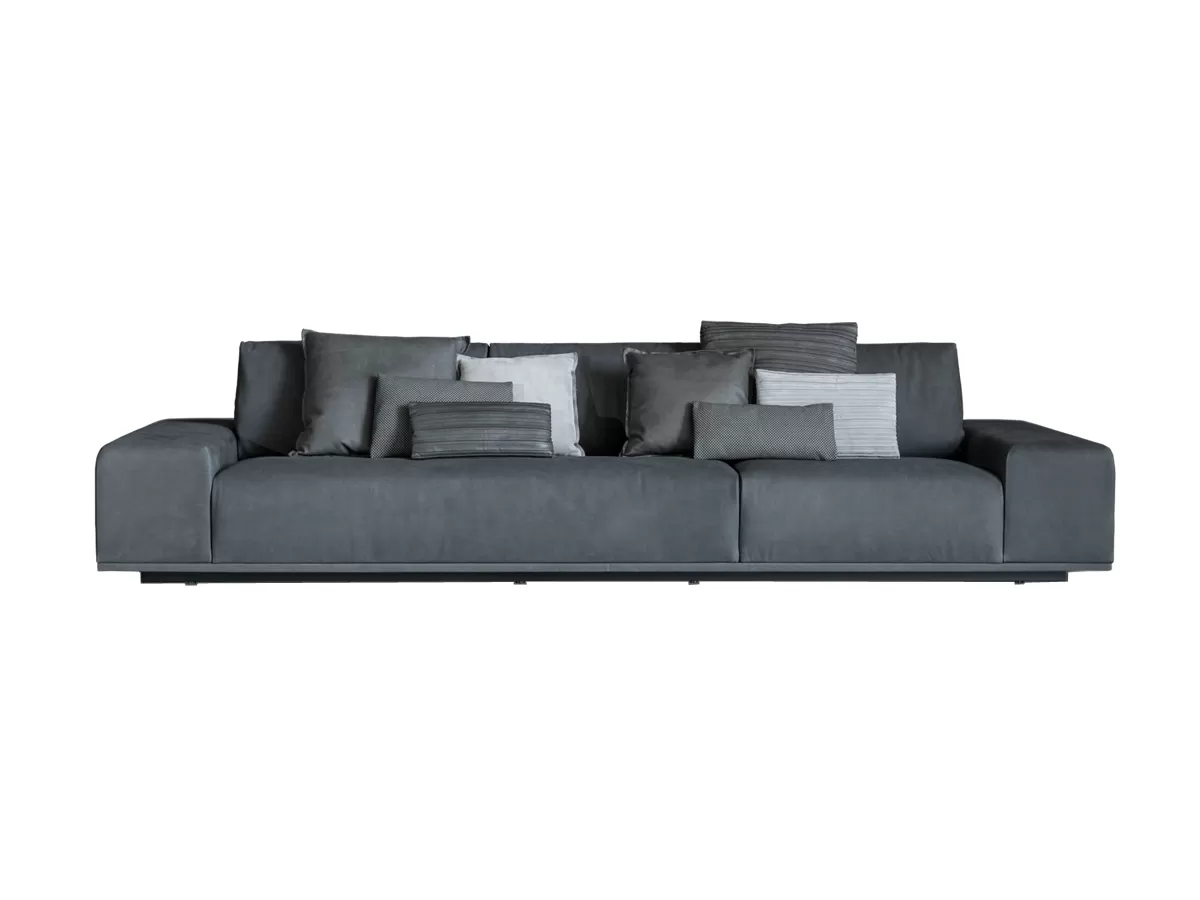 Double-panelled fir and poplar frame. Base in black-stained wood; base beneath body with leather upholstery. Padding in differentiated density foam padding with acrylic fibre covers. Back cushions in washed and sterilized goose down with polyurethane foam insert. Possibility of varying the seat depth by sliding mechanism. The two smaller elements of the cushions (one back and one seat cushion) can be made in a different type of leather and color. Contact us for more information.