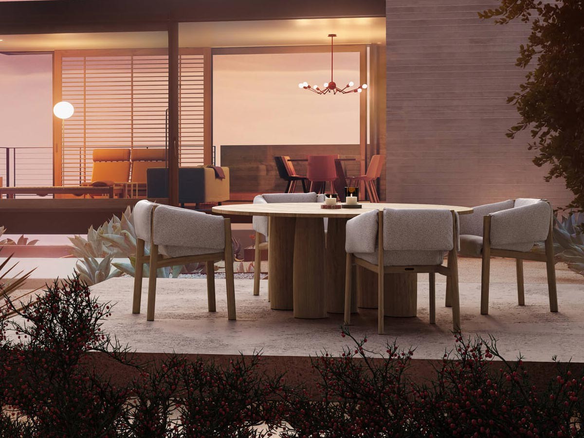 Le fauteuil de salle à manger Plumon de Kettal se caractérise par une structure légère, sur laquelle est cousue une combinaison rembourrée sur mesure. Le rembourrage dit « cannelloni » se caractérise par des coutures qui garantissent un confort absolu. Le rembourrage est posé sur la structure rigide en teck, englobant ainsi l'ensemble de la structure. De cette manière, le fauteuil Plumon s'adapte parfaitement aux espaces extérieurs de la maison. Le confort est également souligné visuellement, grâce au rembourrage qui englobe les accoudoirs et l'extérieur du dossier.