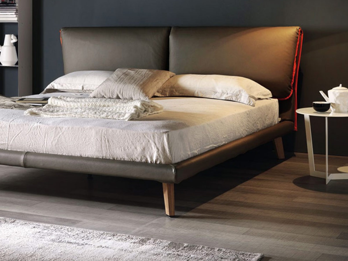 Adam by Cattelan Italia is a double bed covered in leather or synthetic leather, with wood feet. Available in different colors and sizes.