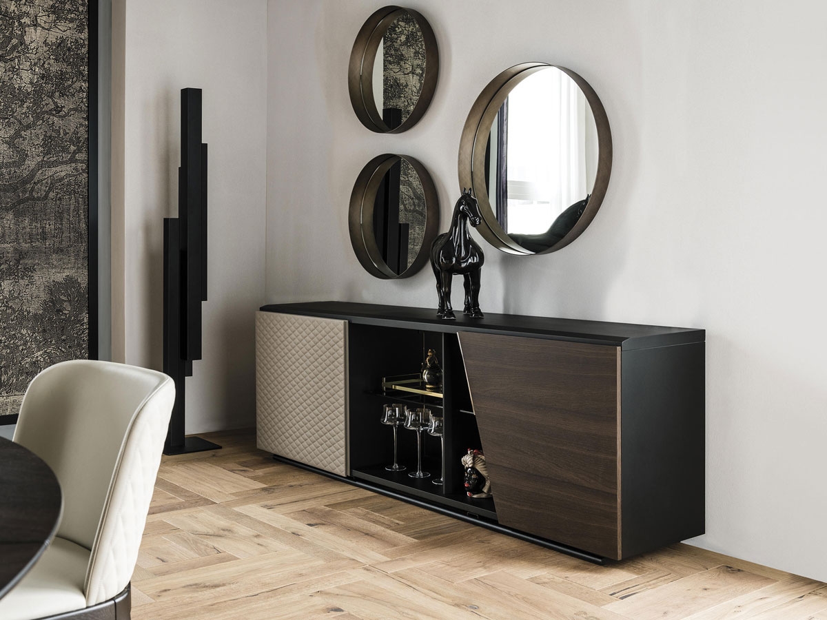 Aston est un nouveau buffet de Cattelan Italia. Une émeute de matériaux mixtes et des finitions en peluche, il transforme un élément simple de meubles en une opportunité de conception aimée. La porte gauche couverte et matelassée en cuir synthétique ou en cuir souple est le détail de luxe qui la rend à la mode.