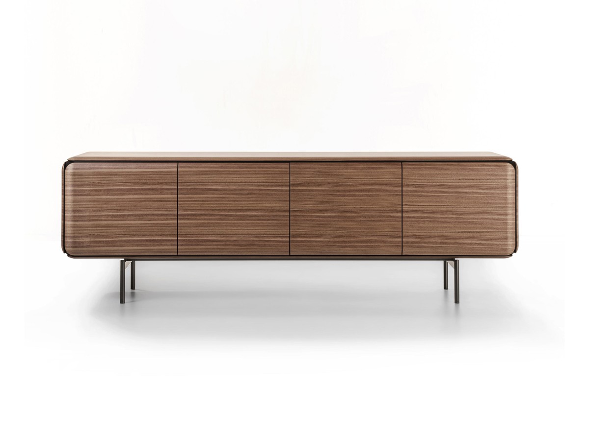 La structure du buffet Pebble est caractérisée par un joint qui, en brisant le volume le long des bords arrondis, allège la perception de l'objet et met en valeur la géométrie des panneaux.