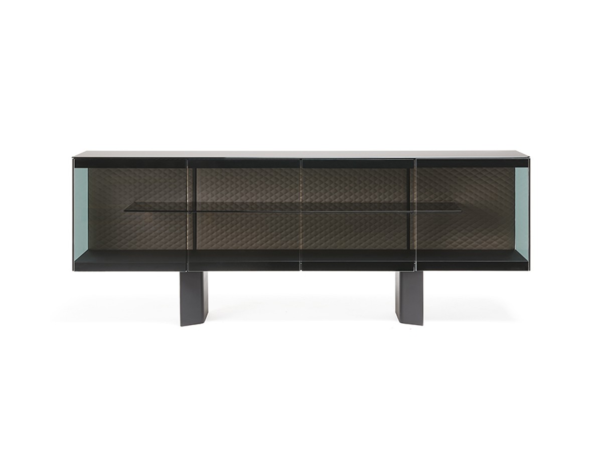 Le buffet Boutique est doté d'un cadre en acier peint en noir gaufré, ainsi que des pieds qui le soutiennent. Les portes et les côtés en cristal fumé sont enrichis de bandes de cristal peint en noir, tandis que le haut et le bas sont en cristal gravé peint en noir. Boutique se distingue surtout par son dossier intérieur en cuir écologique ou en cuir matelassé, selon le livre d'échantillons. L'ensemble du buffet est doté d'étagères internes en cristal fumé éclairées par des diodes électroluminescentes incluses.