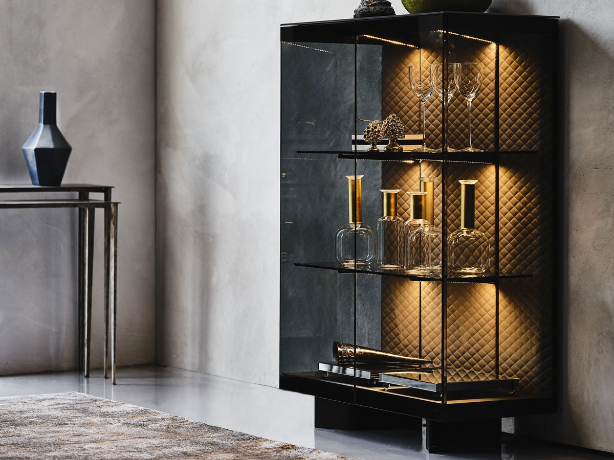 Comme sur une scène de théâtre, exposez vos objets les plus précieux devant un dossier recouvert de cuir matelassé, protégé par une haute porte en cristal. Le buffet Boutique allie la sophistication du cuir matelassé à la simplicité transparente du cristal, créant ainsi un meuble unique. Le buffet Boutique est disponible en version haute ou basse pour répondre à vos besoins.