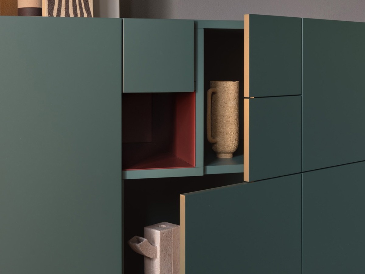 Conchiglia se compose de compartiments fermés par des portes laquées, qui peuvent être personnalisées en utilisant des couleurs contrastées pour les portes et l'intérieur du compartiment.