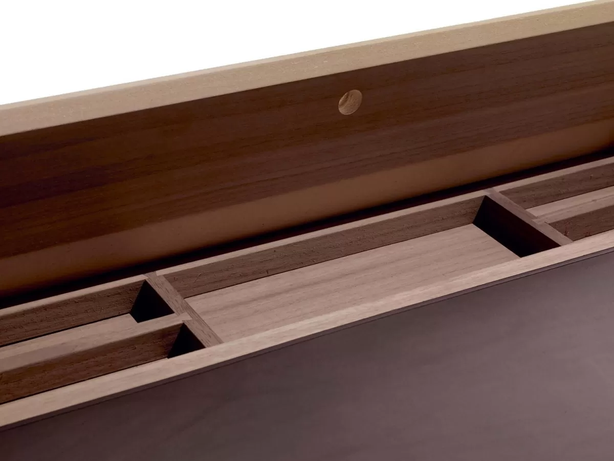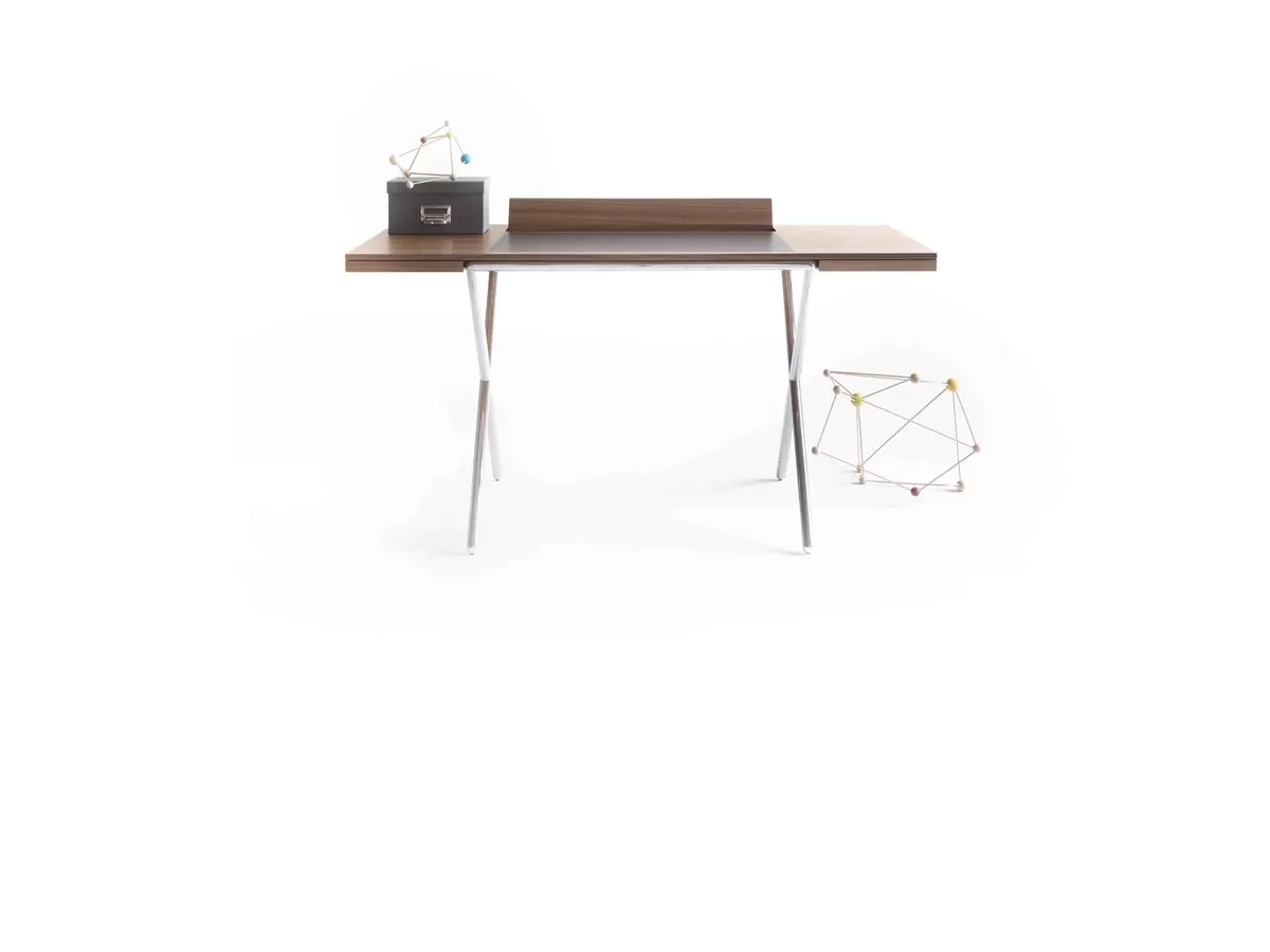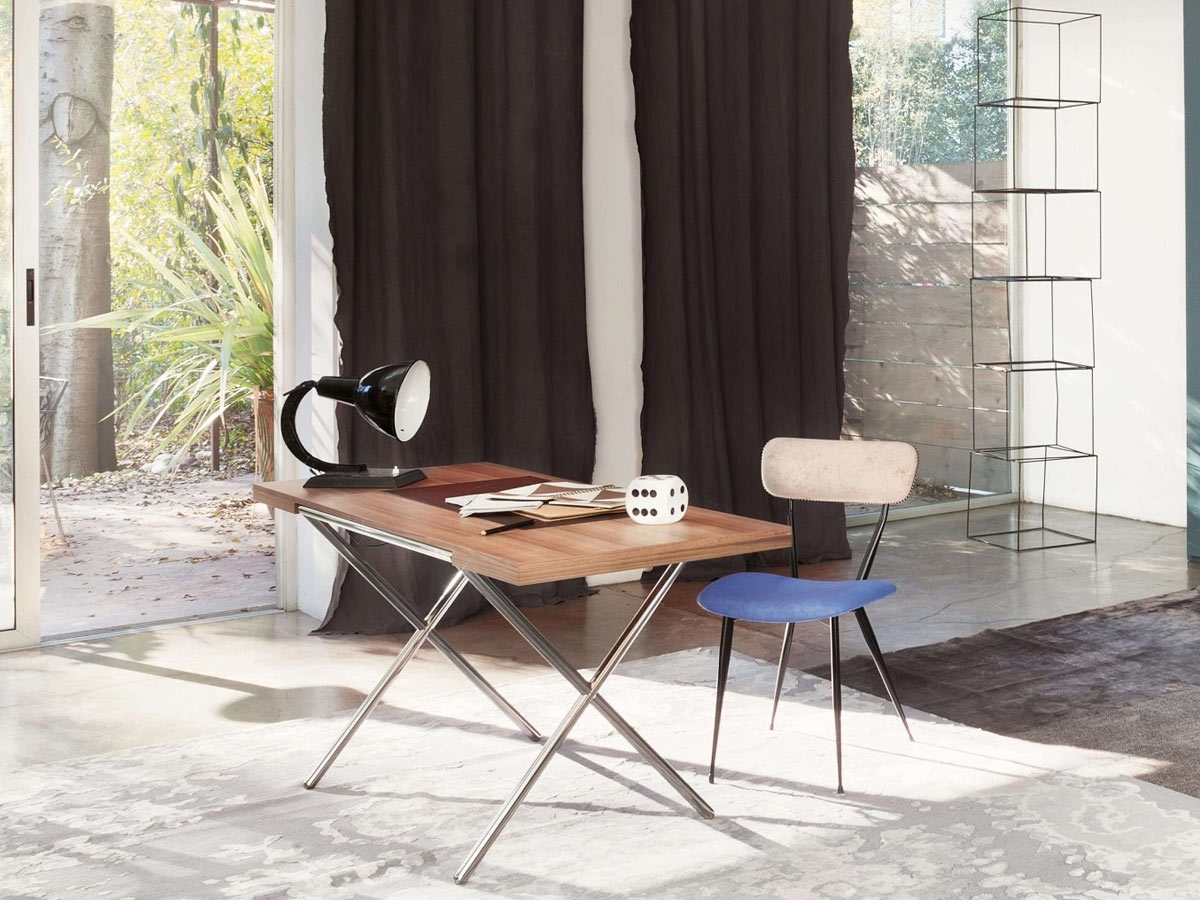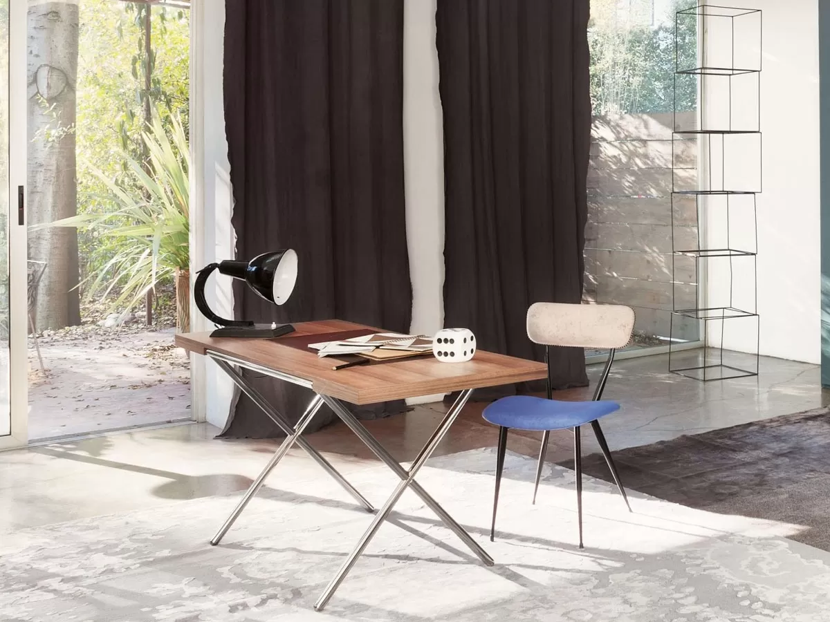 Novelist se compose d'une base avec deux pieds croisés en métal chromé poli, qui soutiennent le plateau en bois de noyer Canaletto. L'utilisation de ces deux matériaux en fait un meuble moderne capable de s'affirmer comme le protagoniste de l'espace. Lema est une entreprise qui a le souci du détail, c'est pourquoi deux tiroirs latéraux et un compartiment à crayons sont intégrés dans l'épaisseur réduite. Enfin, il y a la particularité du sous-main en cuir.