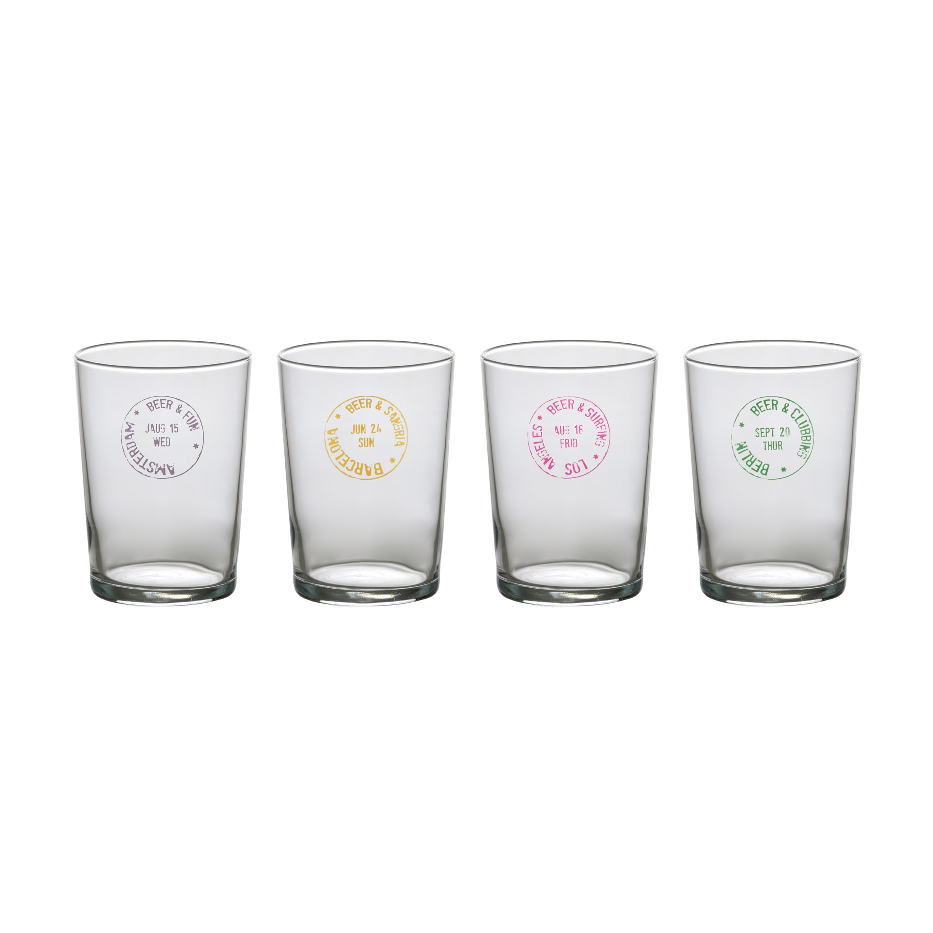 Travel by Bitossi is a set of four beer glasses with the design of stamp. Dishwasher safe, this set is available in two different version.