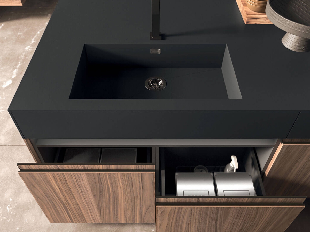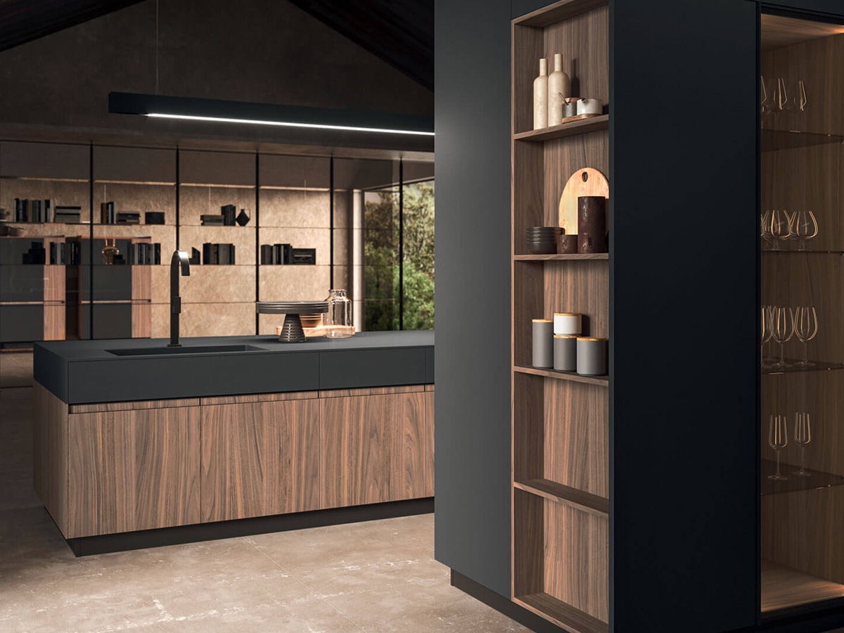 Superfici opache soft-touch antimpronta dell'isola cucina contribuiscono alla piacevole sensazione tattile. Il piano in Fenix di ampie dimensioni nasconde al suo interno comodi e profondi cassetti. Cassetti interni e cestoni sono organizzati in sistemi studiati appositamente per ospitare posate, pentole e tutte le altre attrezzature normalmente utilizzate in cucina ogni giorno.
