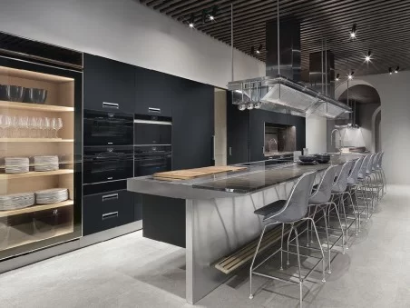 Con la cucina Lignum et Lapis Inox potrai cucinare e al tempo stesso condividere l'esperienza con i tuoi ospiti e familiari. L'isola della cucina Lignum et Lapis nasce come una unità a sé stante, operativa e luogo di ritrovo: infatti, da un lato gli ospiti possono assistere alle preparazioni, dall'altro lato si trovano gli strumenti e chi cucina può muoversi liberamente.