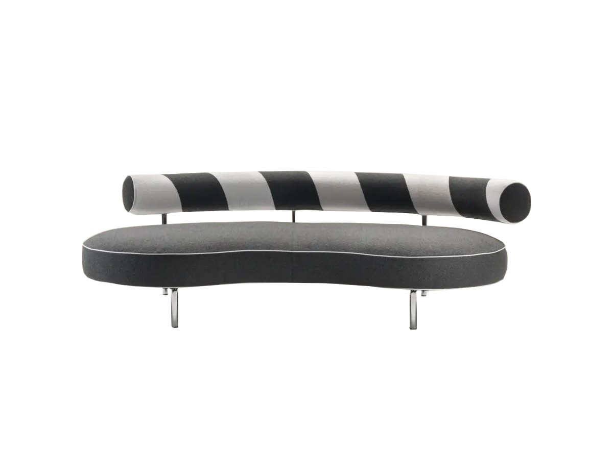 Supermax presenta delle proporzioni ampie e una struttura in metallo tubulare di chiara ispirazione razionalista con un inconfondibile schienale imbottito di forma cilindrica che riprende il tradizionale divano. Il cuscino di seduta a forma di fagiolo è stato riprogettato nelle dimensioni e nell'imbottitura.