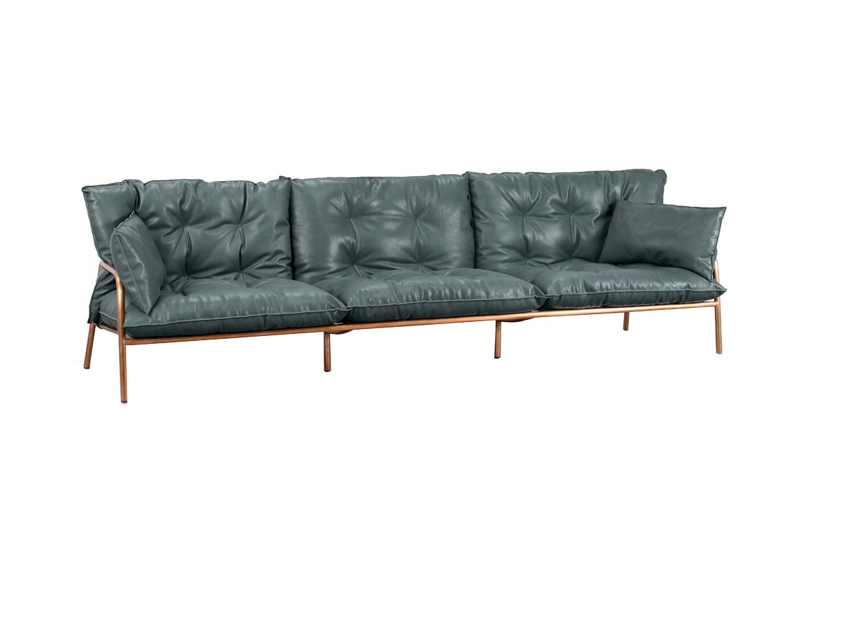 Il divano Elephant di Baxter si compone di una struttura in tubolare di rame acidato verderame con vernice protettiva trasparente opaca, arricchita da una cuscinatura disponibile in pelle Lido o in tessuto outdoor con imbottitura in poliuretano espanso a densità differenziata e viscofibra con fodera idrorepellente outdoor.