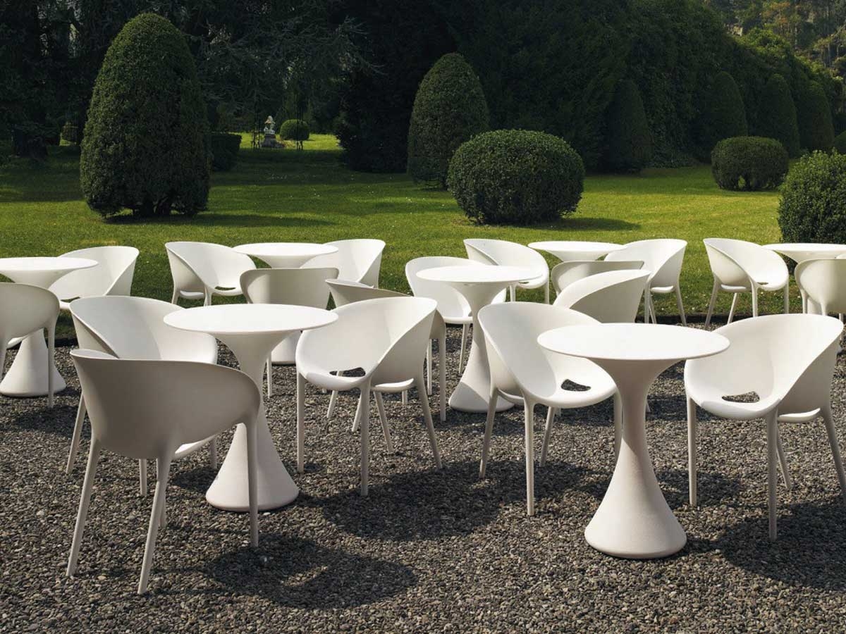 Tavolo Kissi Kissi, design Miki Astori per Driade, con struttura e piano in polietilene, si adatta sia all'interno che all'esterno della casa, grazie alla leggerezza unita a stabilità ma soprattutto praticità di manutenzione e resistenza agli agenti atmosferici.