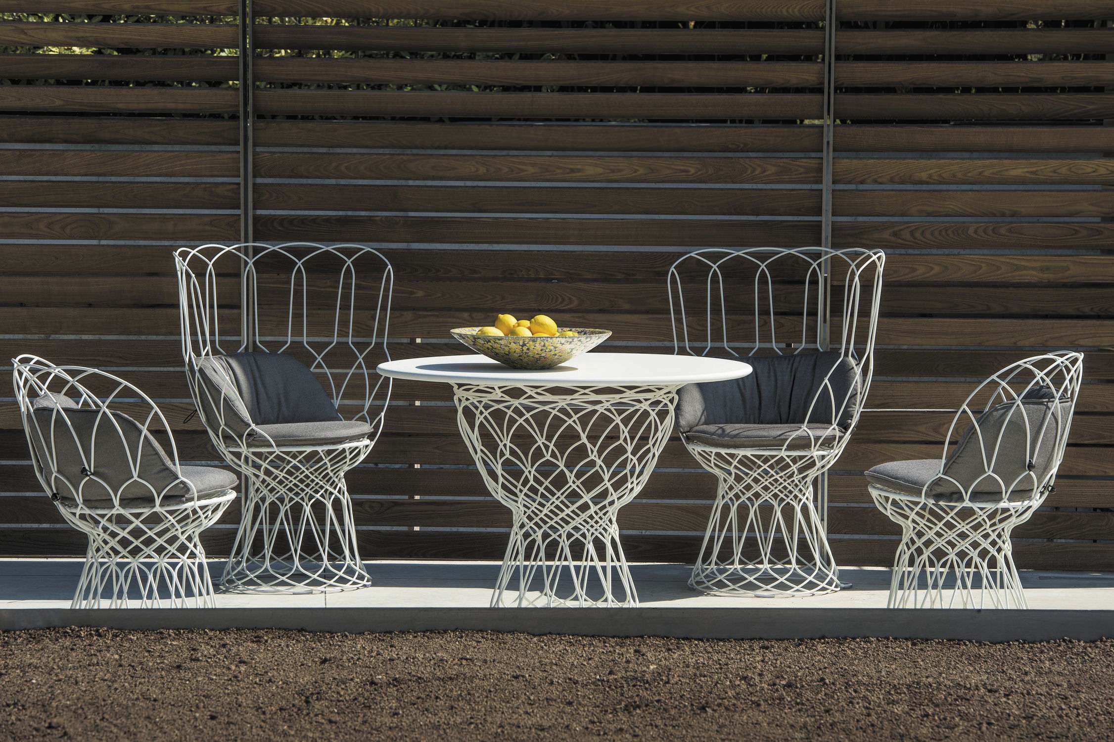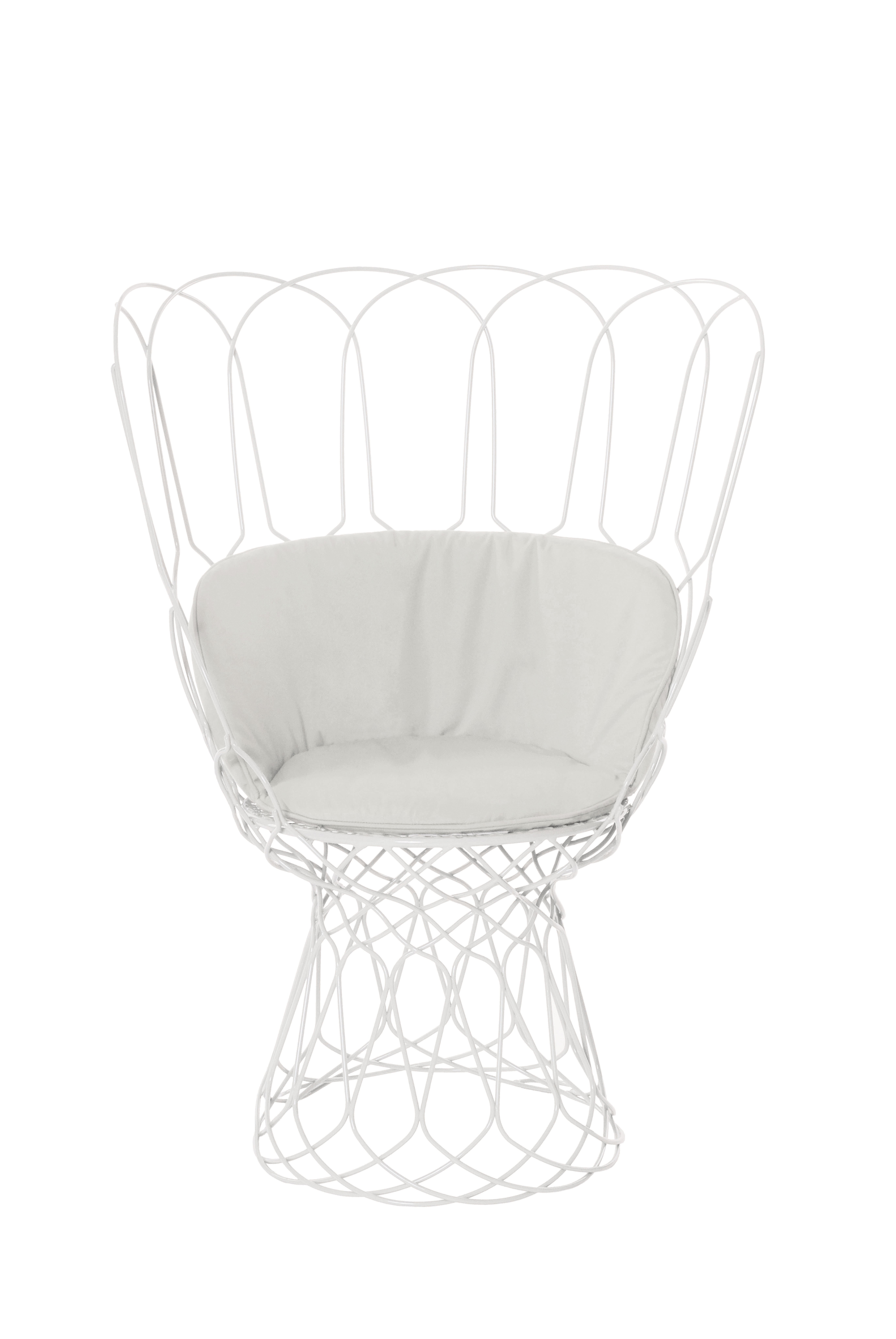 La poltroncina Re-Trouvè è caratterizzata da disegni geometrici e losanghe ripetute creando forme accattivanti. Si inserisce in modo naturale in ogni ambiente outdoor.