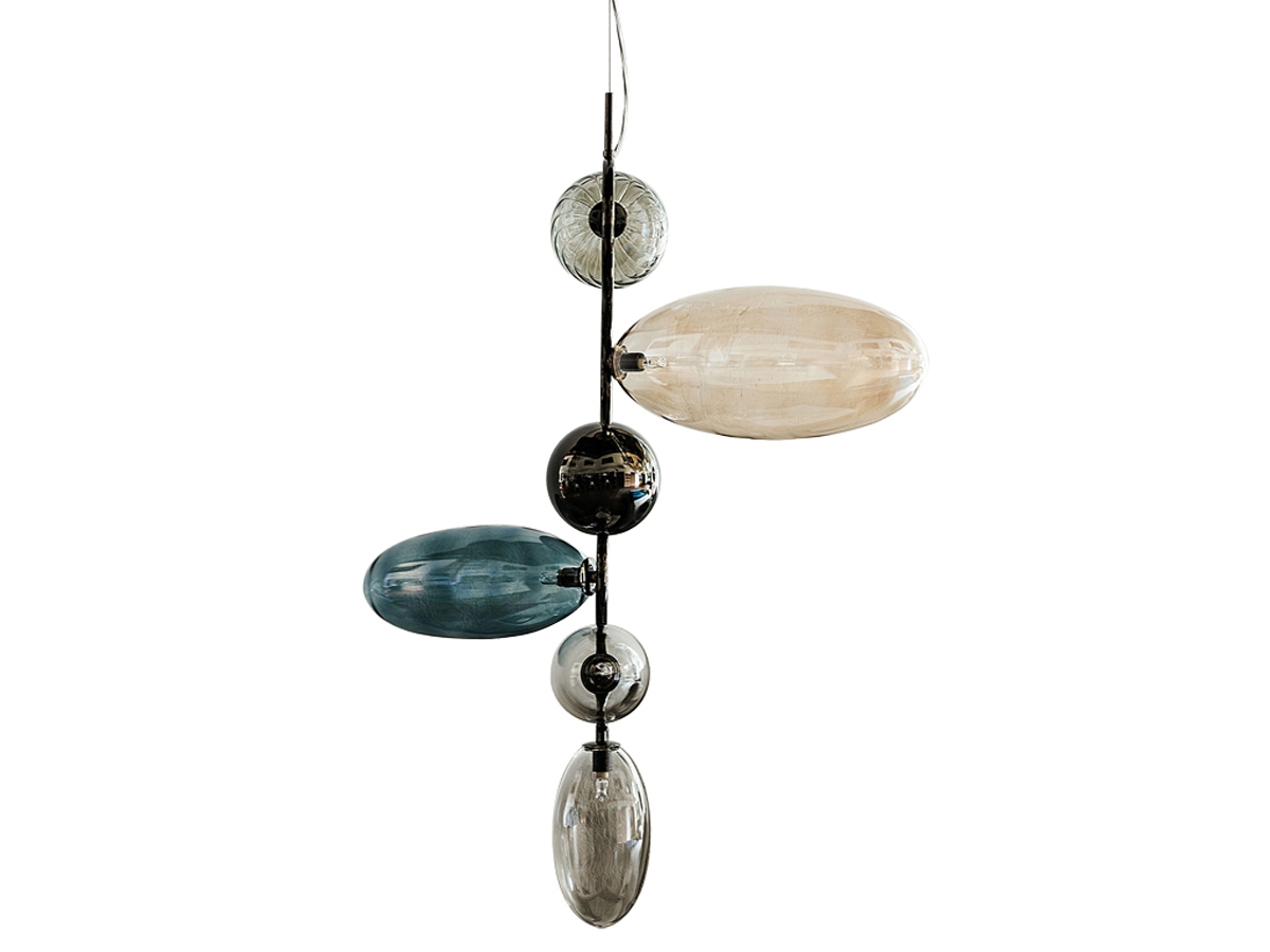 Struttura in acciaio cromato nero. Paralumi in vetro borosilicato trasparente, fumè, azzurro ed ambra. Lampadine incluse.