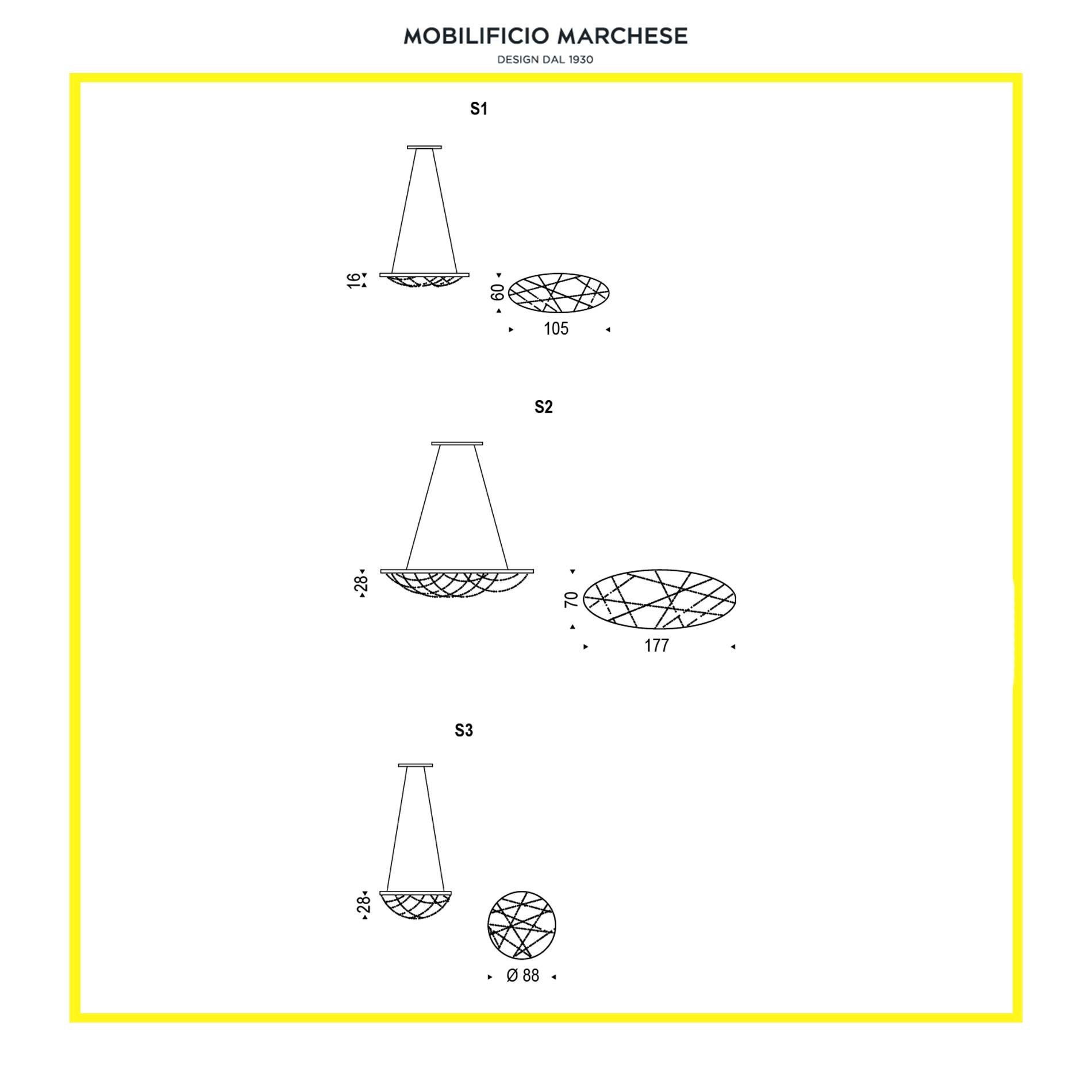 Lampada a sospensione con telaio in acciaio Nichel satinato. Paralume composto da pendagliere in cristallo. Attacchi G9 max 25W.