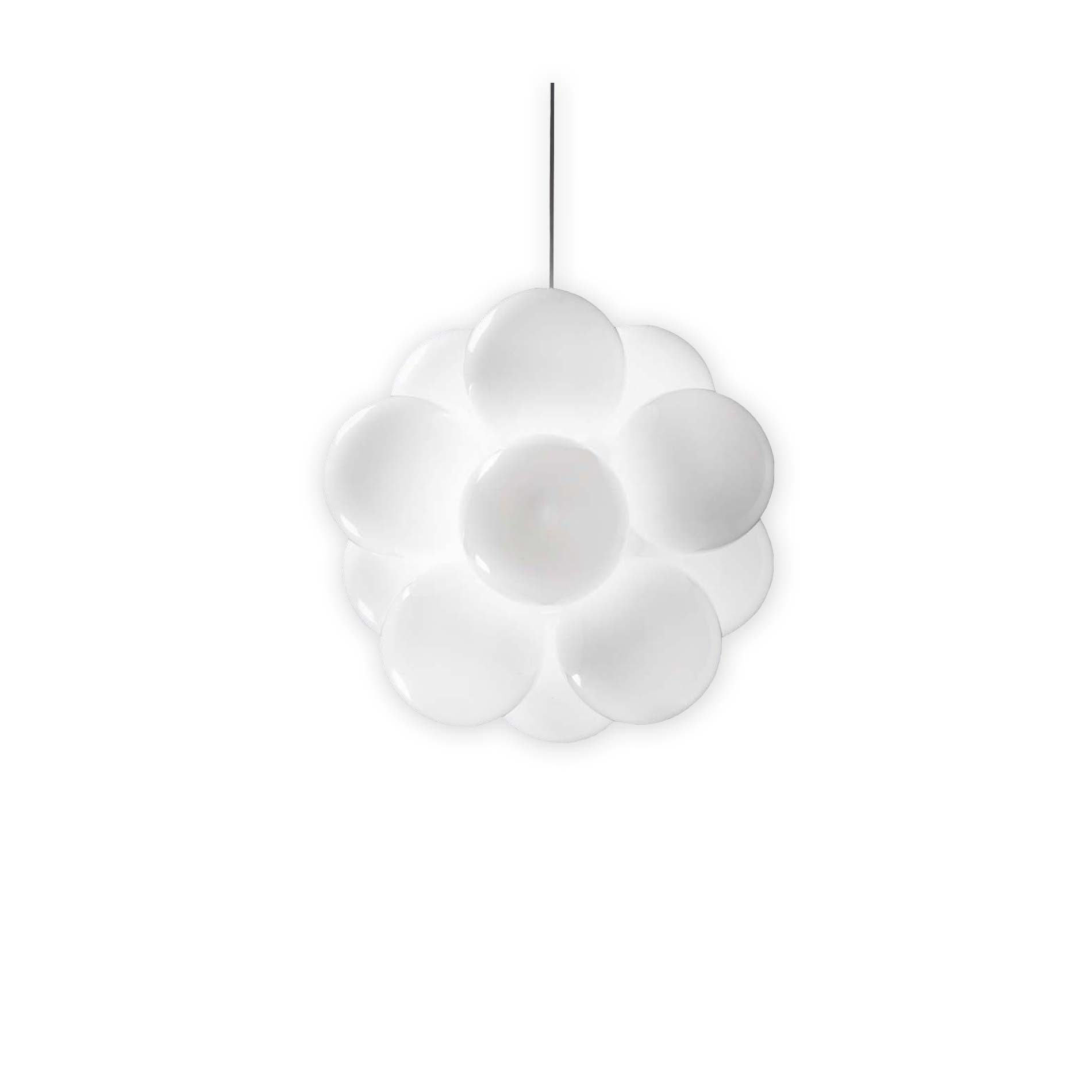 Struttura in polietilene laccato bianco lucido. Diffusori in vetro bianco lucido. Questa lampada è dotata di 12 punti luce. Lampadine G9 alogene con attacco bispina da 20W.