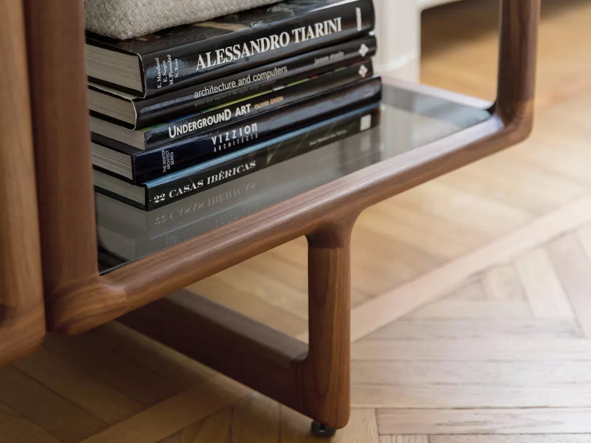 Progettata da David Dolcini, la libreria Myria di Porada è un capolavoro realizzato a mano da maestri artigiani, perfetto in ogni dettaglio. Le mensole in vetro temperato affumicato poggiano su una solida struttura in noce canalletta che aggiunge una romantica leggerezza visiva. Il morbido calore del legno e il vetro freddo creano un equilibrio perfetto, uno stile unico.