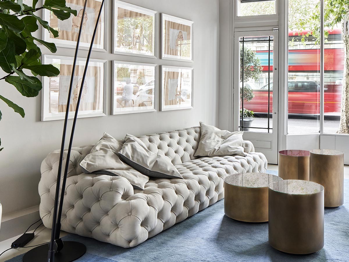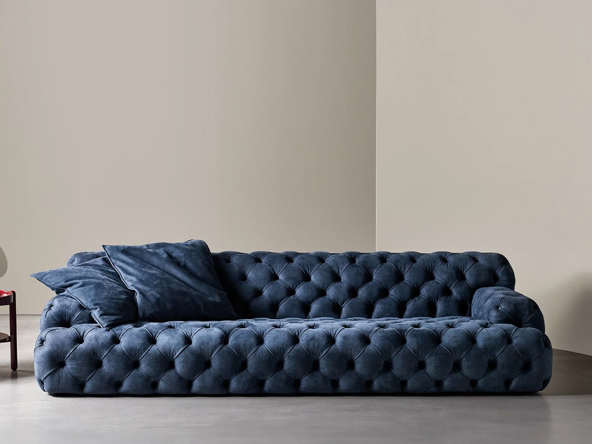 Disponibile in due diverse dimensioni, potrai abbinare il divano Norton Capitonné all'omonimo pouf per creare un angolo di relax affascinante e accogliente.