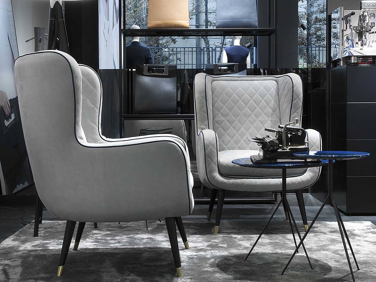 Dettagli come il puntale del piedino in ottone, il rivestimento cuscinatura e bordatura con speciale trapuntatura a quadri e il profilo decorativo nella medesima tonalità di cuoio o nelle altre tonalità di cuoio previste dal catalogo conferiscono alla poltrona Dolly un sapore antico ma al contempo moderno.