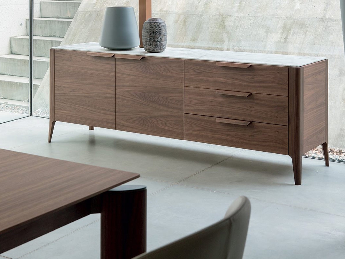 La credenza Atlante 3 di Porada è un prezioso elemento di arredo, realizzato con una combinazione di legno naturale e marmo. Sobrio ed essenziale, è concepito per essere il punto focale di qualsiasi sala da pranzo, oltre che una perfetta soluzione di interior design. Viene fornito con due ante e tre cassetti a chiusura soft. Il ripiano in marmo lo rende un elemento d’arredo chic e di lusso. La compattezza del parallelepipedo è supportata da piedini sottili, che creano un insolito contrasto e restituiscono a pieno un effetto di leggerezza alle forme. Artigianato Made in Italy creato con amore, ora disponibile a un prezzo molto speciale.